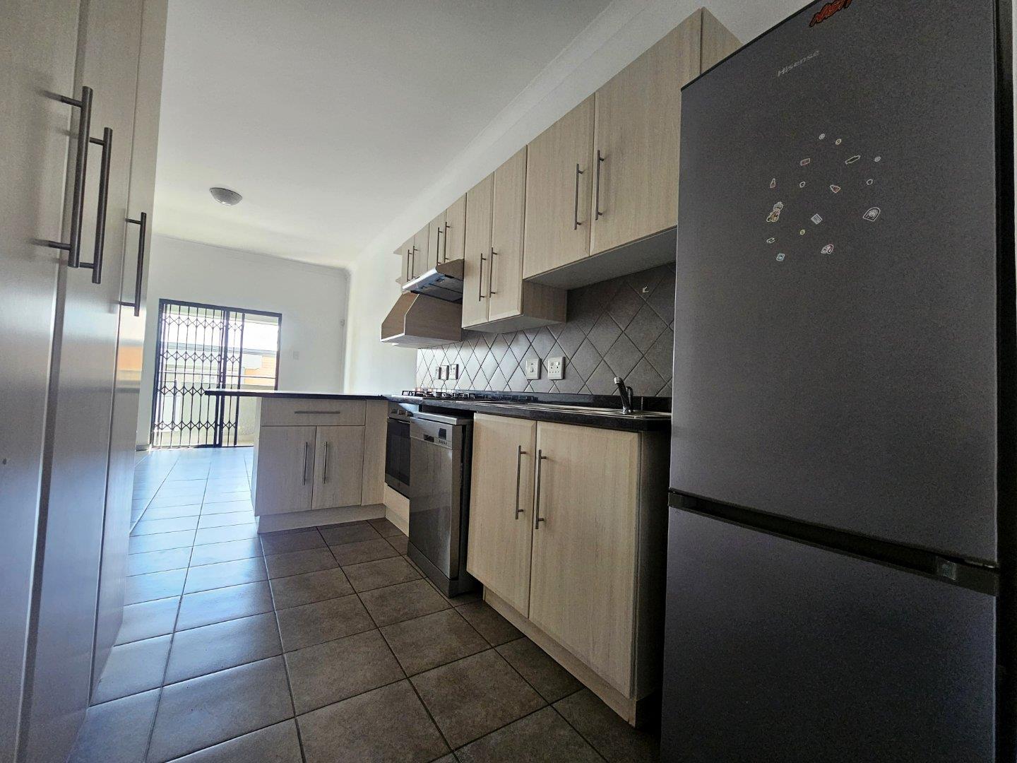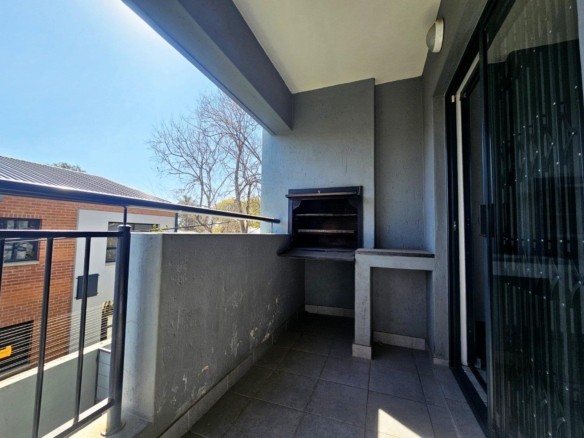 Perched on the first floor, the unit features a private balcony with a built-in braai, perfect for relaxed afternoons or entertaining guests. Step into a modern open-plan kitchen fitted with a gas stove top, electric oven, and sleek finishes, seamlessly flowing into a spacious lounge area.