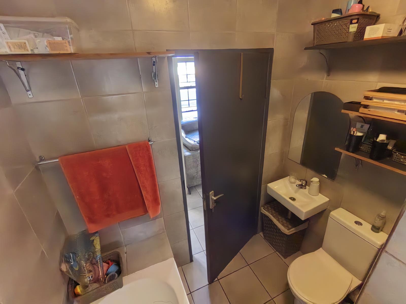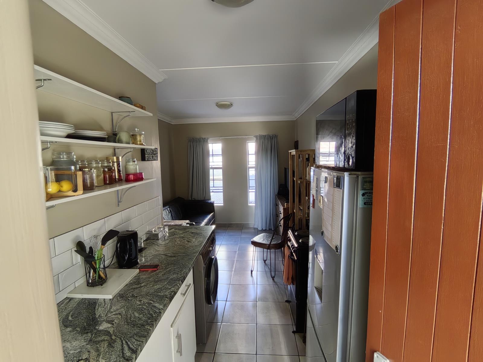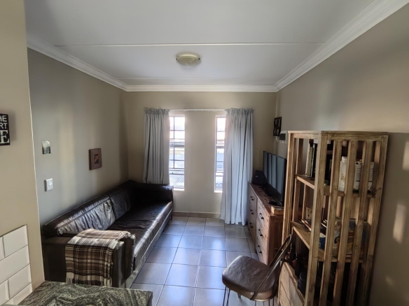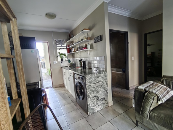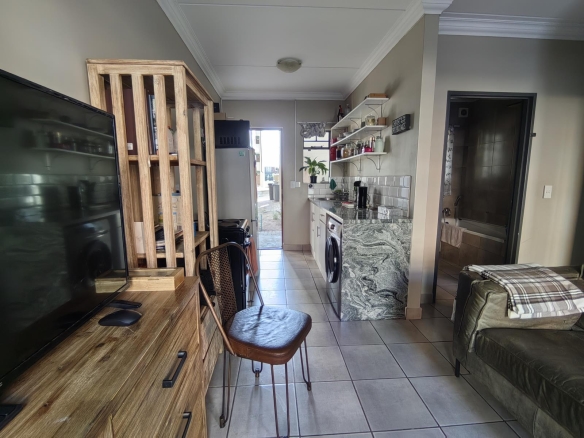 Within a gated complex with 24 hour security, this ground floor unit has an open-plan lounge and kitchen with tiled flooring, with the lounge having a large window for natural light. The kitchen includes a free-standing stove, oven, built-in cupboards, and a sink.