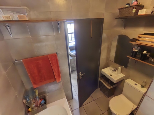 Both bedrooms have built-in cupboards and tiled floors. The bathroom includes a bathtub with a showerhead, basin, and toilet.