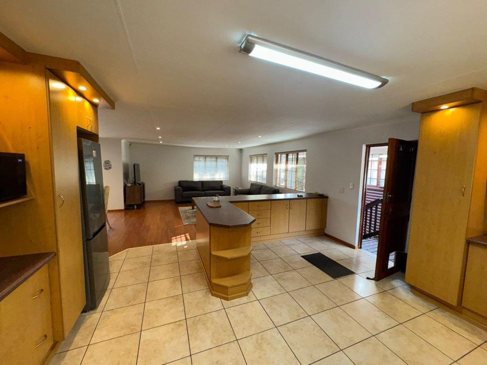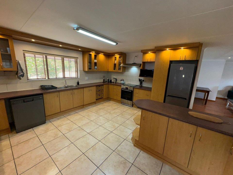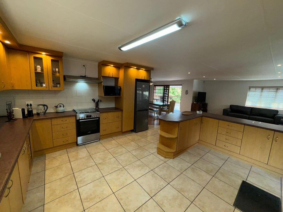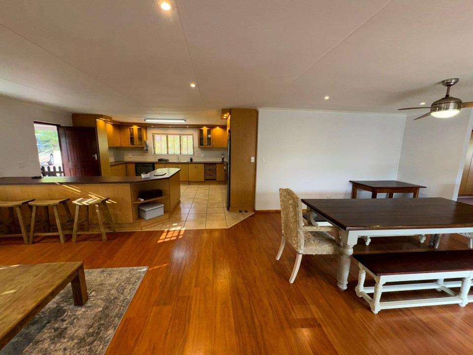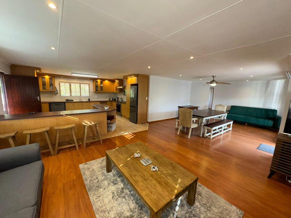 Step into the inviting open-plan living area, featuring elegant laminated flooring and sliding doors that lead to a spacious wooden deck — perfect for enjoying stunning views over the fairway. The generously sized kitchen, complete with ample built-in cupboards, scullery facilities, a dishwasher connection, and a gas hob, ensures effortless entertaining and convenience.