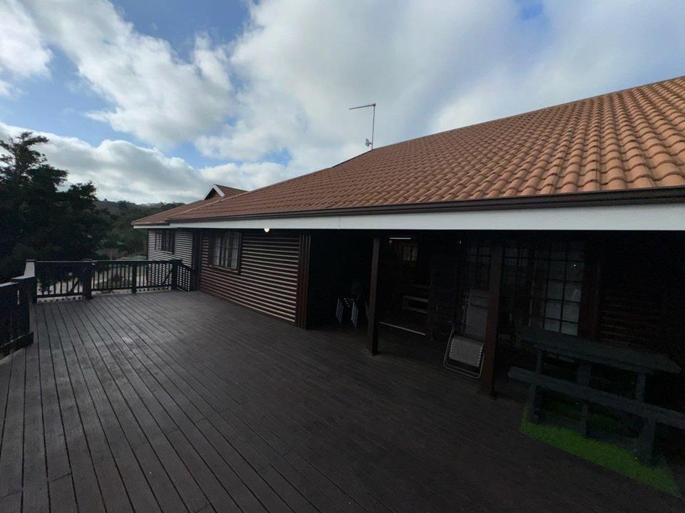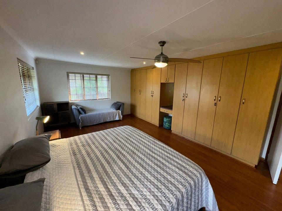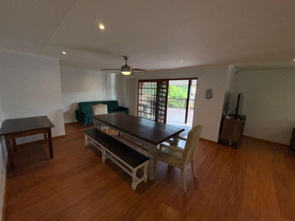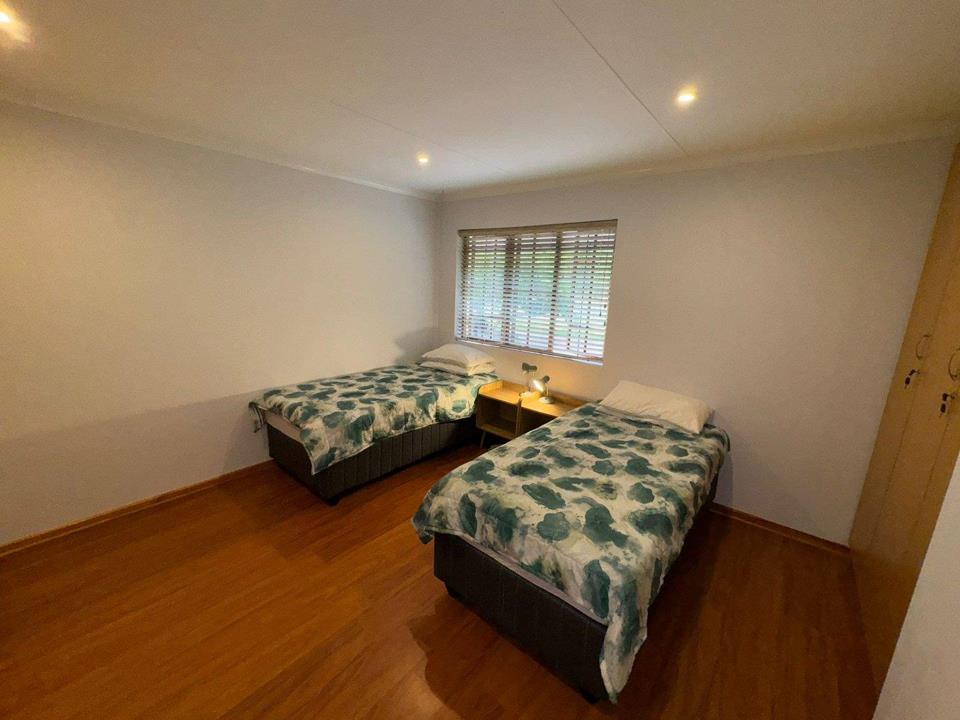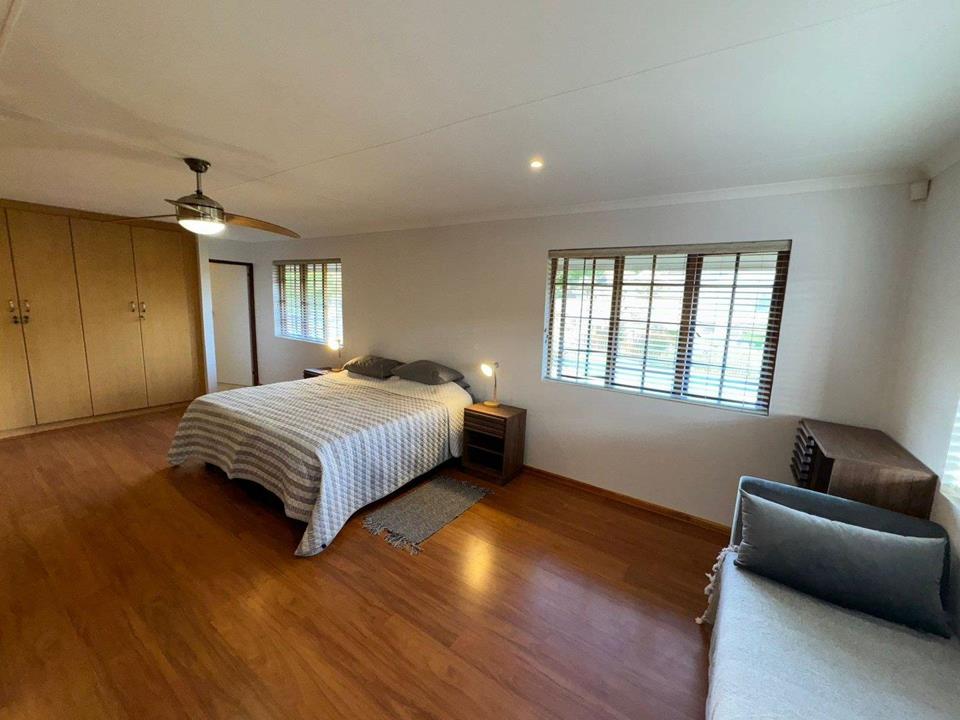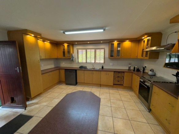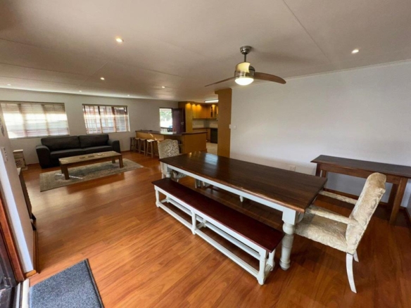 Step into the inviting open-plan living area, featuring elegant laminated flooring and sliding doors that lead to a spacious wooden deck — perfect for enjoying stunning views over the fairway. The generously sized kitchen, complete with ample built-in cupboards, scullery facilities, a dishwasher connection, and a gas hob, ensures effortless entertaining and convenience.