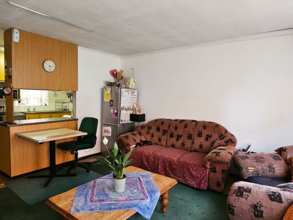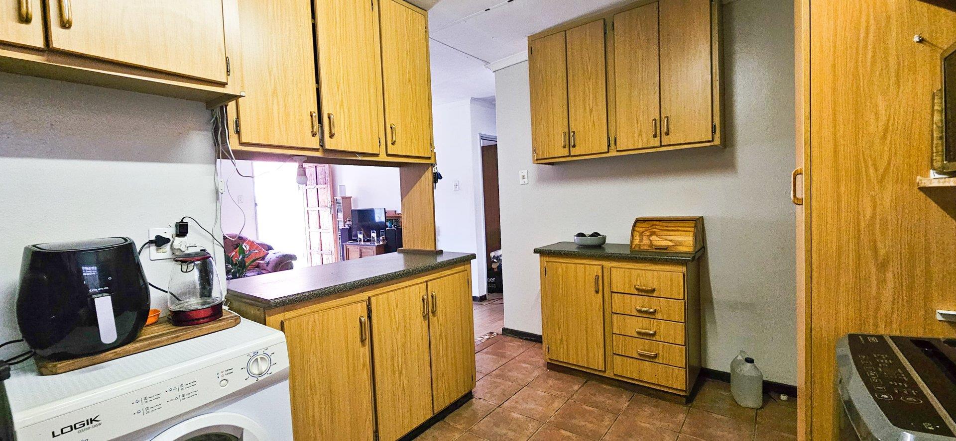 Experience the seamless flow of an open-plan kitchen with built-in cupboards, merging into a spacious lounge area.