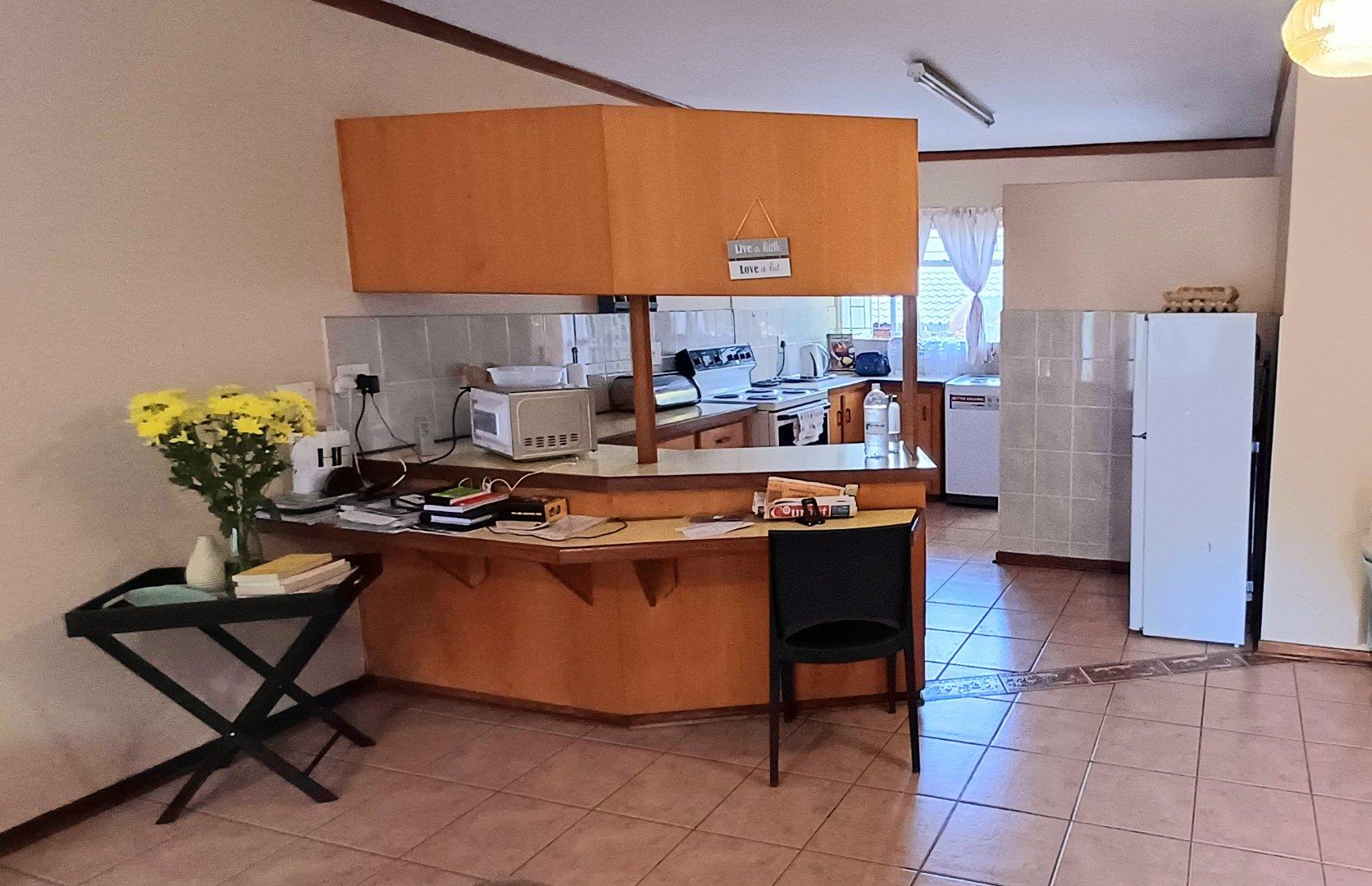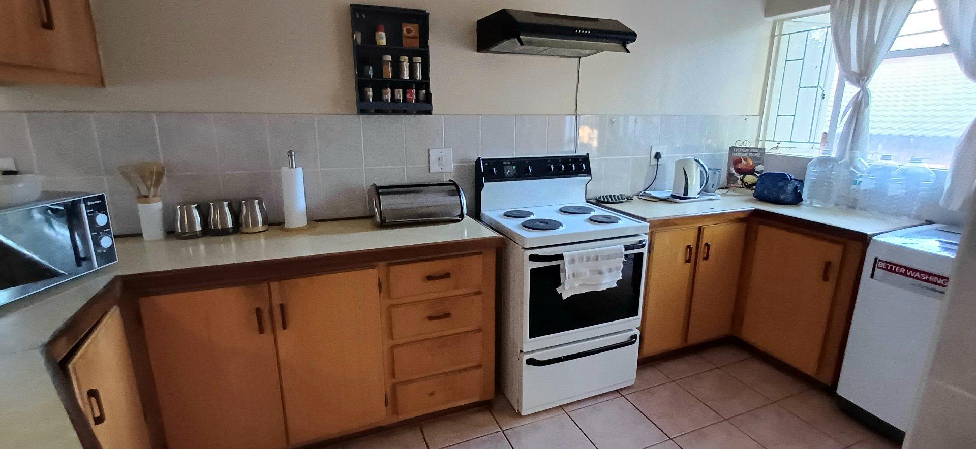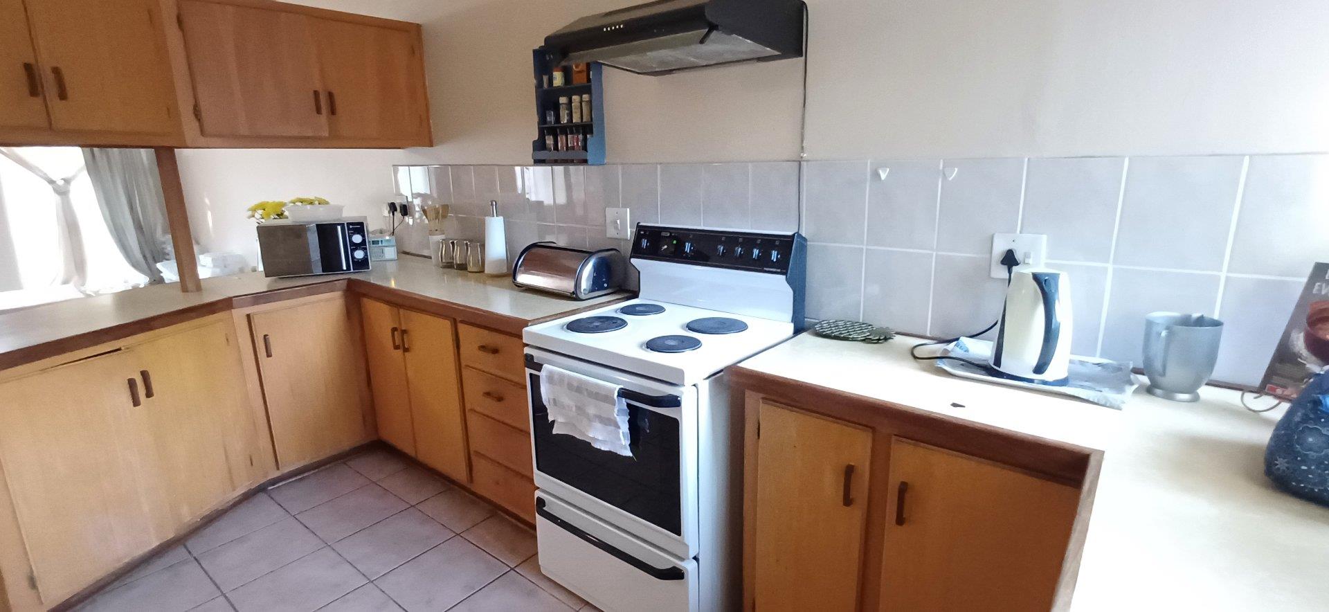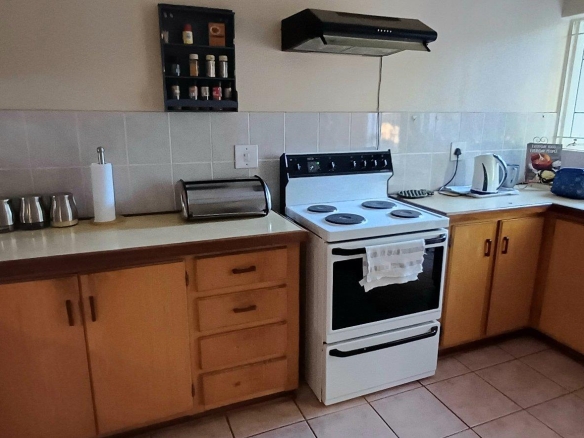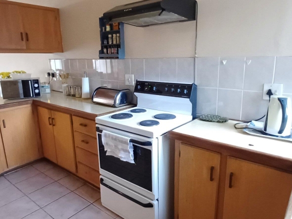 This townhouse is neatly tiled and offers big open-plan living and dining areas. An open-plan kitchen with a breakfast nook and stove is included.