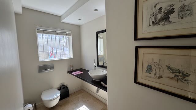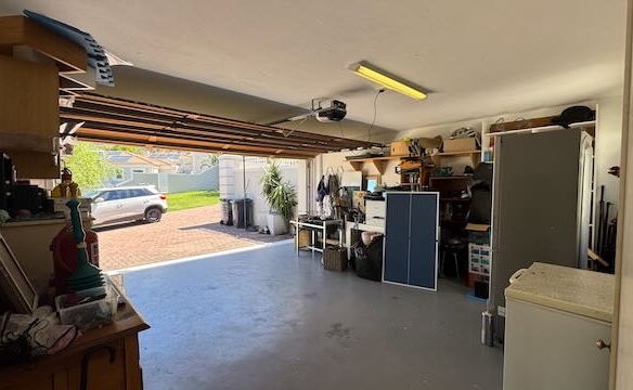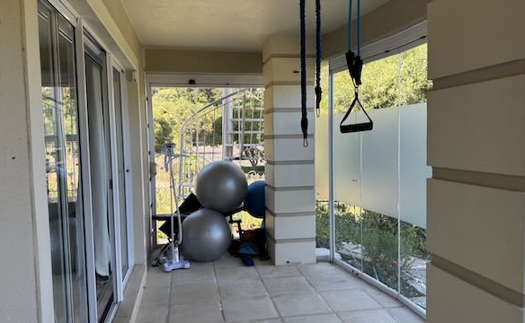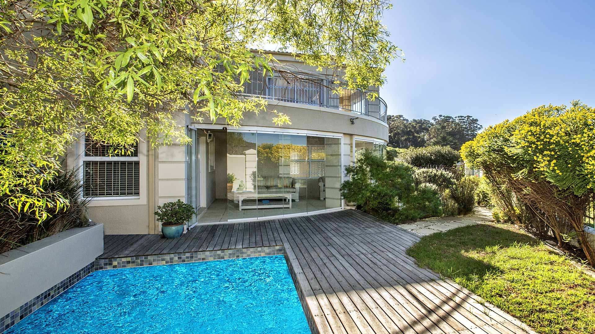 There’s ample parking for at least four cars, and another two in the garage, plus guest parking. Downstairs, you’ll find three bedrooms (two en-suites and another smaller room with built-in cupboards). leading off the master suite and the second bedroom is an enclosed patio used as a gym/play area. The garden area includes a small, heated pool with a heat pump