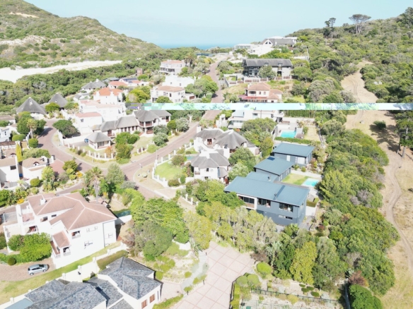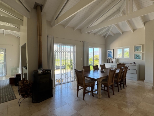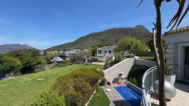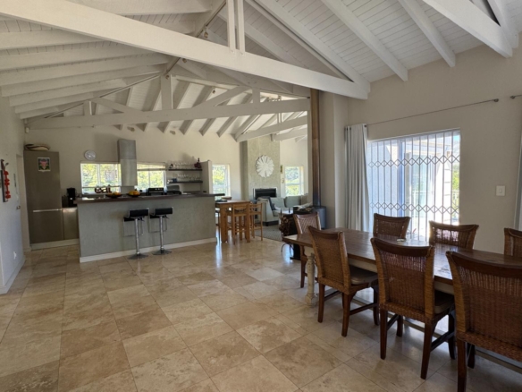 The home features an open-plan lounge and dining area with both gas and wood fireplaces, a spacious balcony with sea views, and a fully equipped kitchen and scullery. The property comes fully furnished with high-speed fiber available and a heated pool.