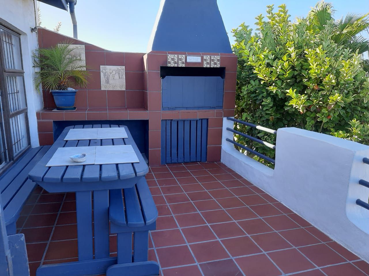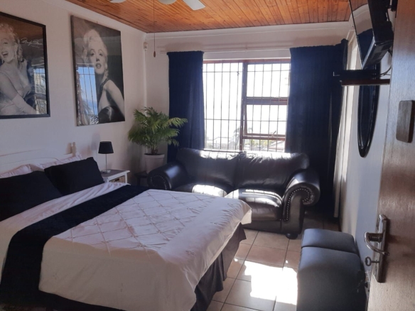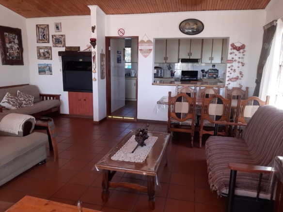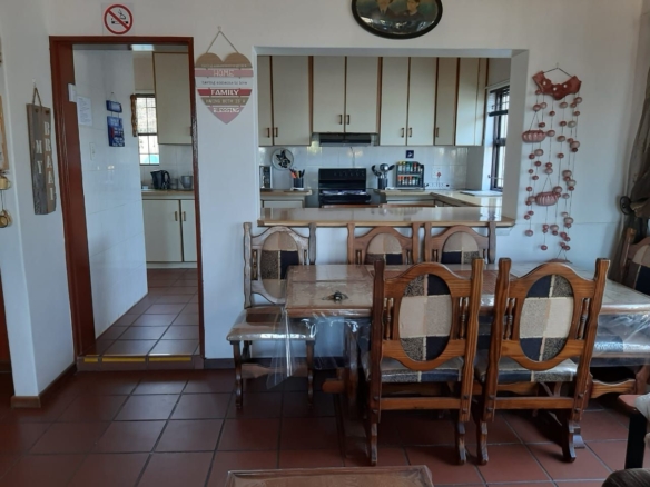 The spacious living room is designed for relaxation, centered around a cozy fireplace that creates a warm and inviting atmosphere. This area flows seamlessly into a dedicated entertainment space, complete with a built-in braai, making it perfect for hosting gatherings and enjoying family moments.