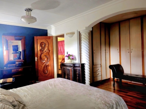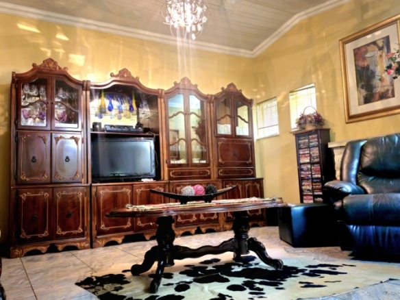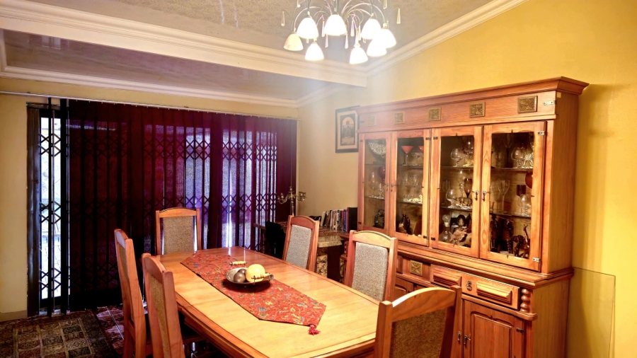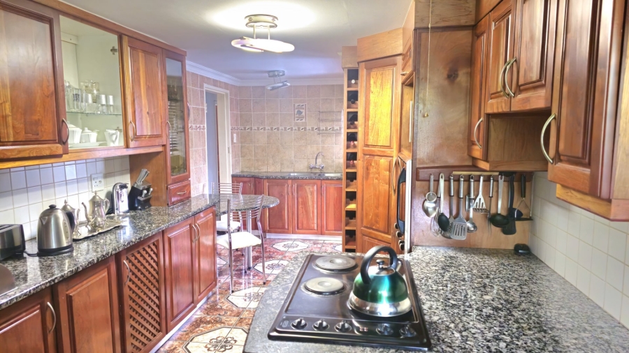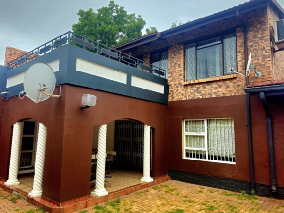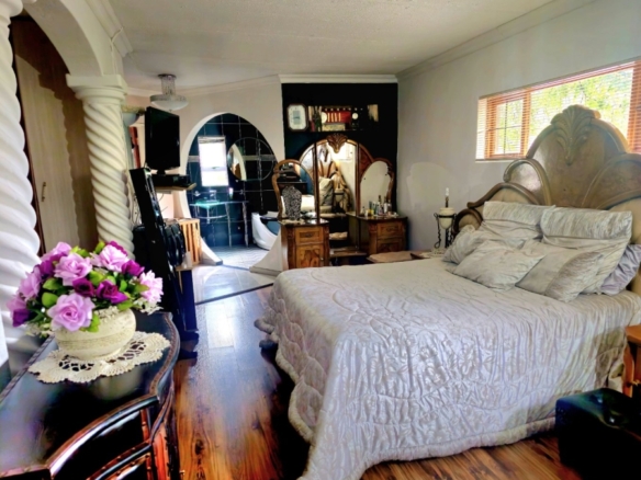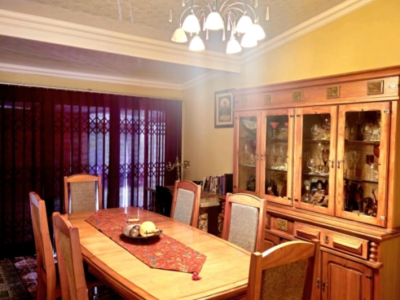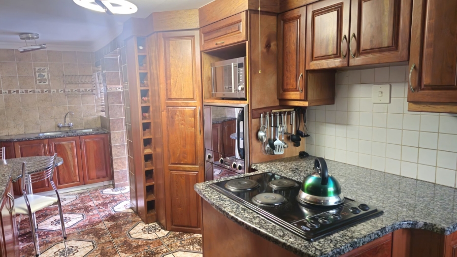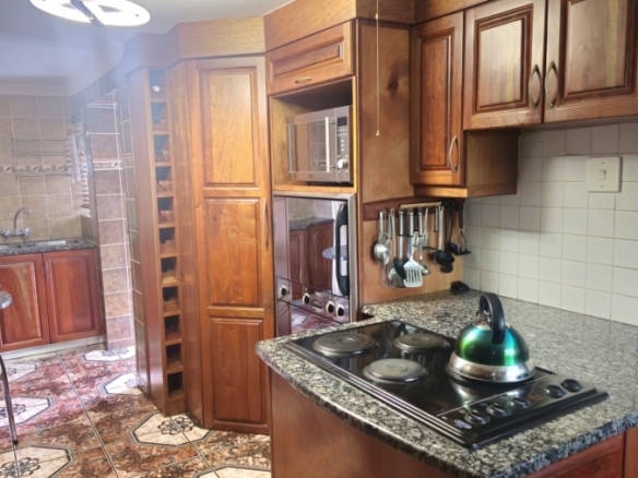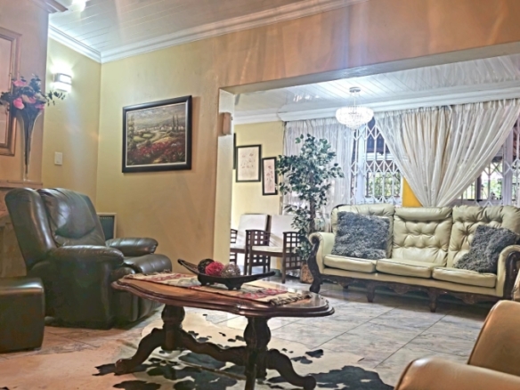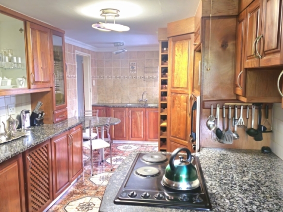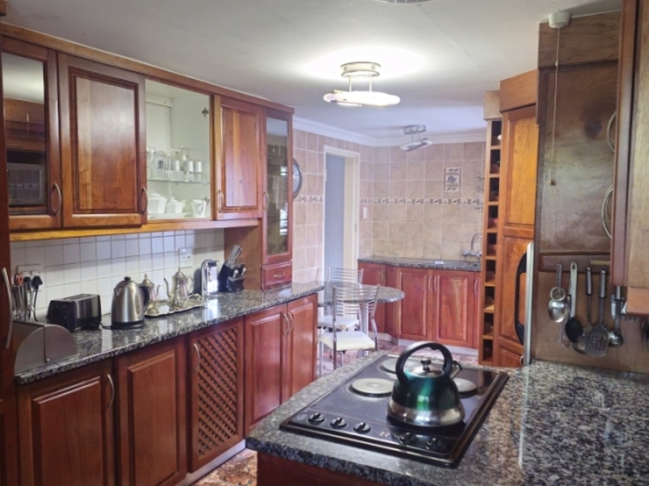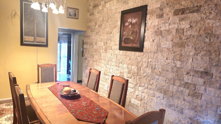 This spacious and well-appointed home offers exceptional comfort and style, featuring an inviting entrance hall that leads into two expansive lounges and a cozy TV room. Perfect for both relaxation and entertaining, the dining room adds to the home’s charm. There are two studies, ideal for home offices or private spaces. Burglar bars and a security gate, you can enjoy peace of mind. The property also includes three garages, a paved driveway, and durable face brick walls. The home boasts four generously sized bedrooms and four bathrooms, ensuring ample space for family and guests. A domestic helper’s room provides added convenience. For outdoor living, the home offers a refreshing swimming pool and an entertainment area perfect for hosting gatherings. The fitted kitchen, with elegant granite countertops, is a chef’s dream. Additionally, a carport provides extra parking space. This home is a perfect blend of luxury, practicality, and security.