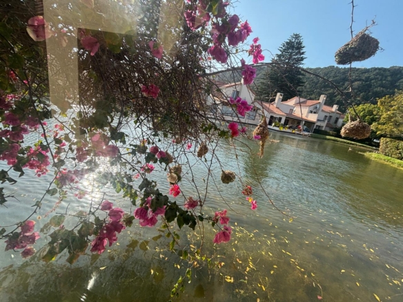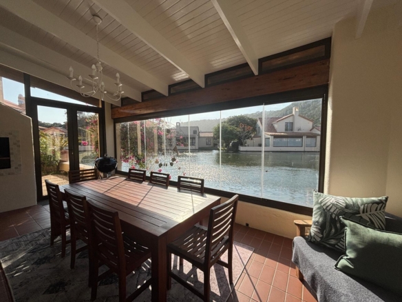 ~ Terraced dining and entertainment area with large glass windows as well as glass doors leading out onto the garden area overlooking the pond and hillside.
