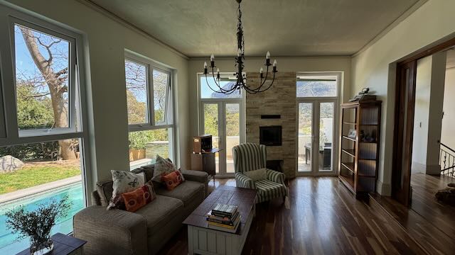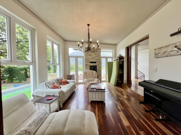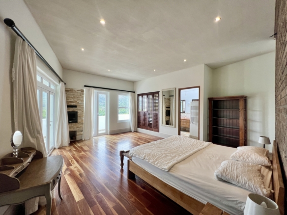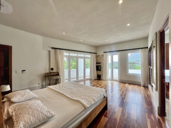 • Spacious Living: The home features four en suite bedrooms, with two upstairs bedrooms opening onto private balconies that showcase stunning mountain views. The open-plan kitchen and dining area are adorned with wooden floors, granite countertops, and a gas stove and electric oven. Three fireplaces—two in the lounge and one in the main bedroom—ensure cozy winter evenings.
