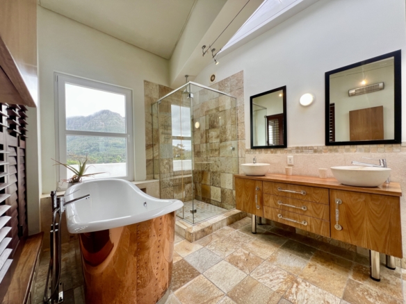 Nestled within the esteemed Northoaks Private Security Estate, this fully furnished 4-bedroom home offers an unparalleled living experience in Hout Bay’s Overkloof area, near Constantia Nek. The estate is renowned for its Georgian-style architecture and lush surroundings, providing residents with a serene and secure environment.