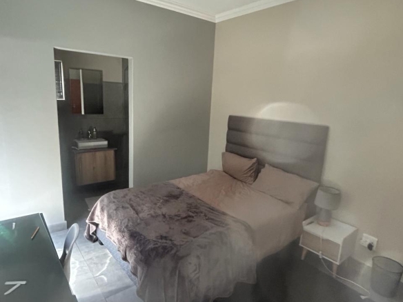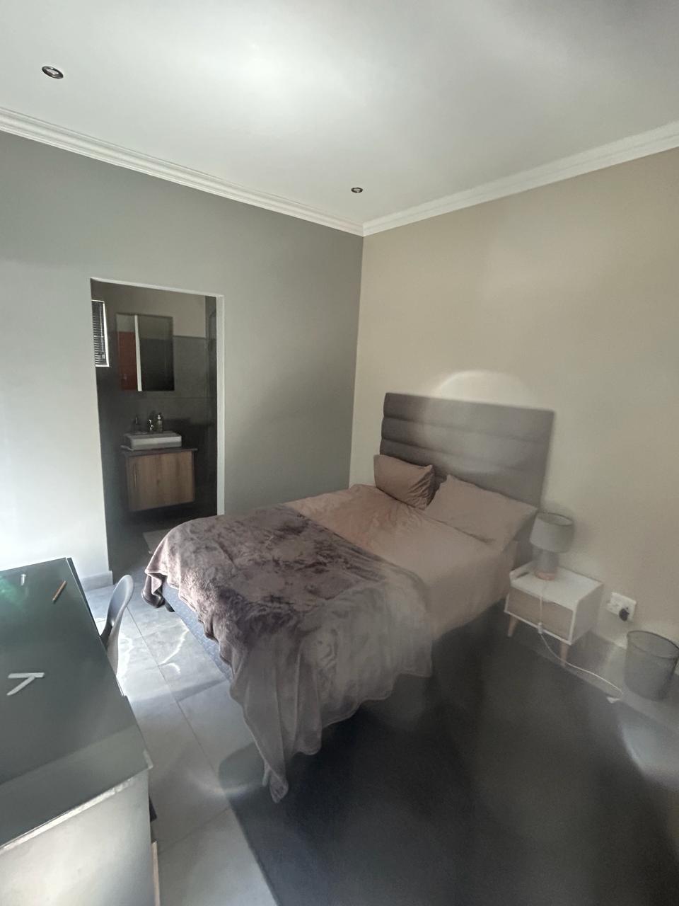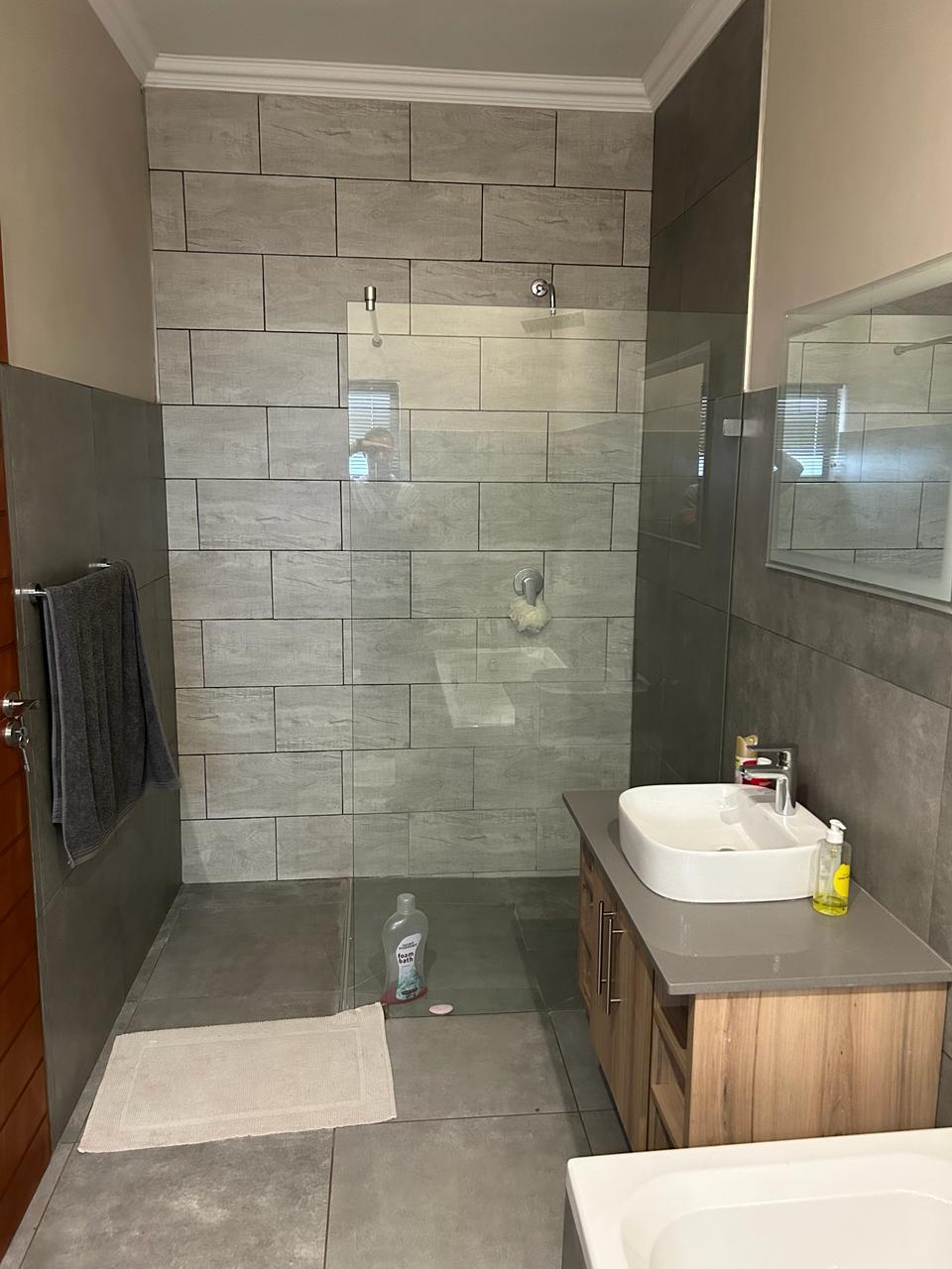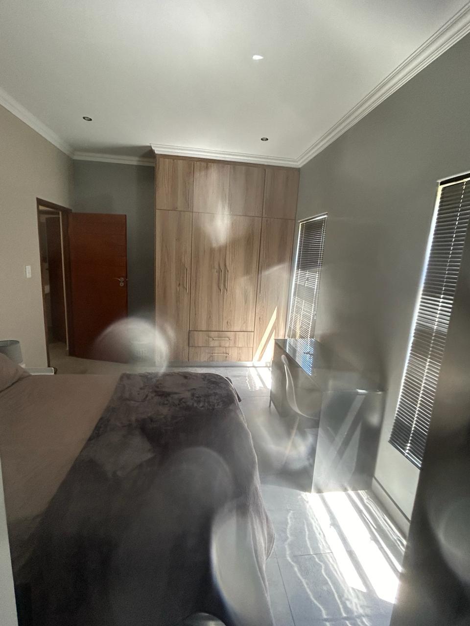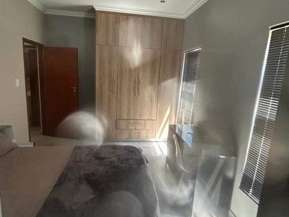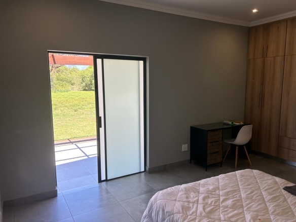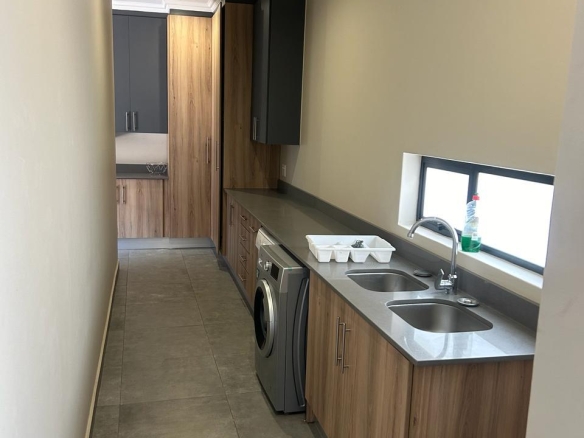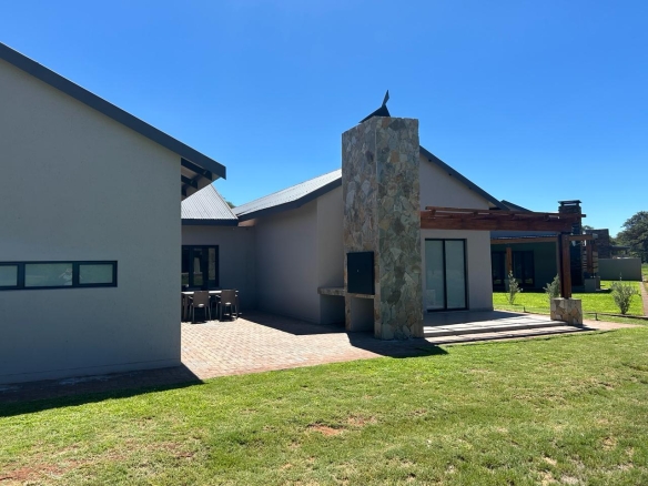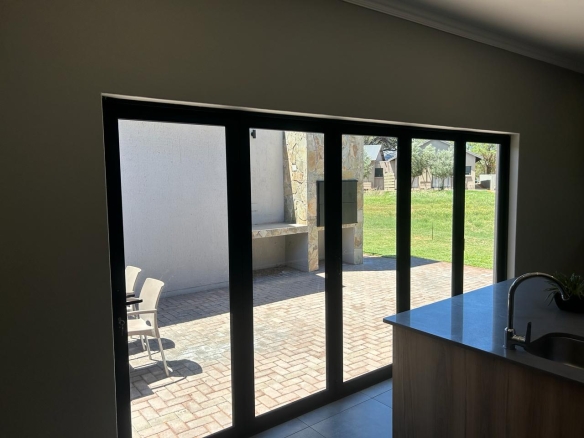 At the heart of the home lies the modern kitchen, complete with a scullery for added practicality, designed to cater to both everyday use and special occasions. The living area extends seamlessly to a built-in braai area, perfect for relaxed weekends with friends and family.