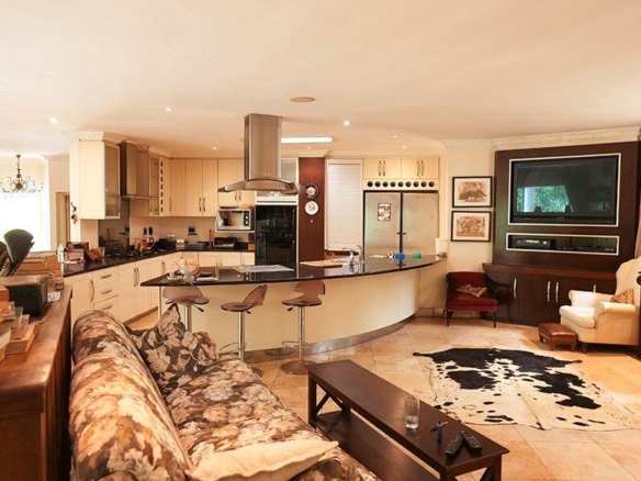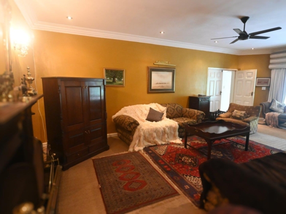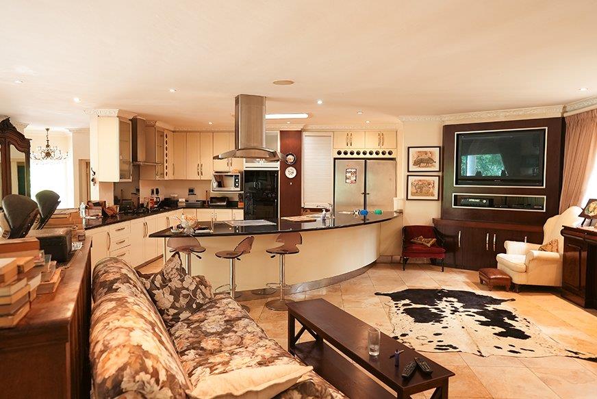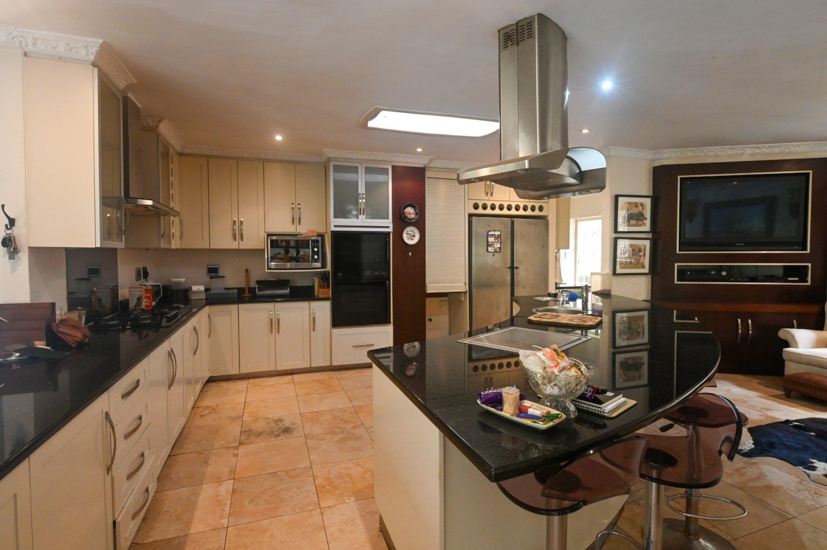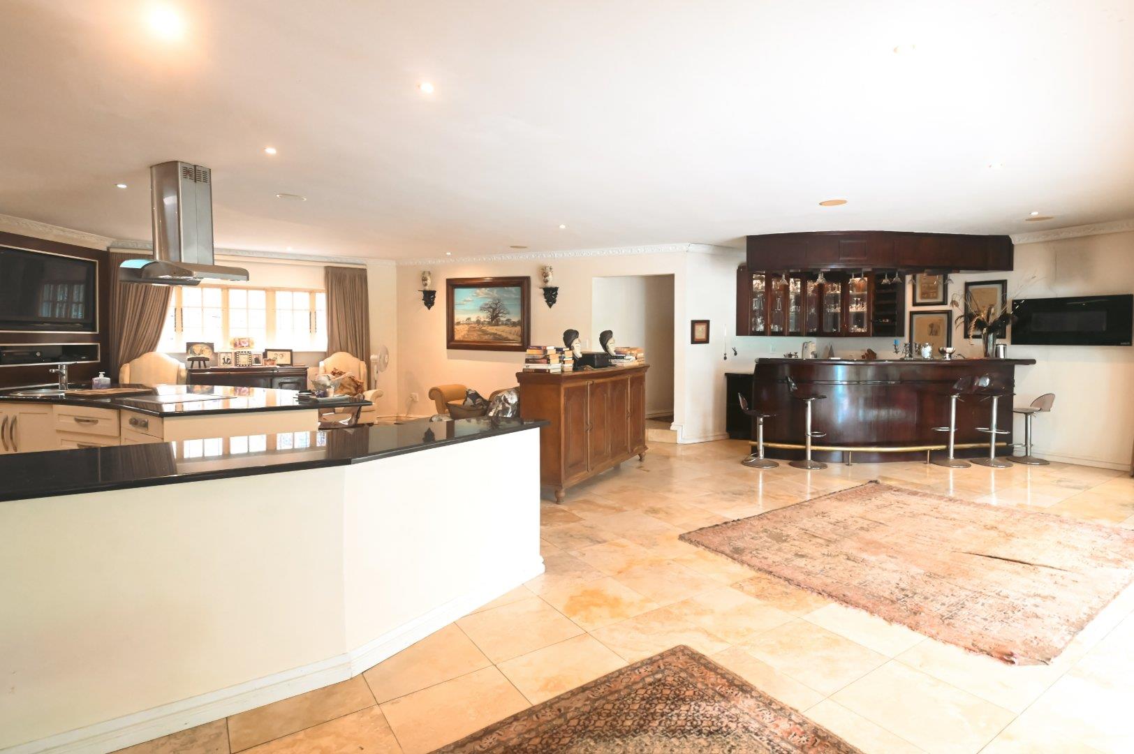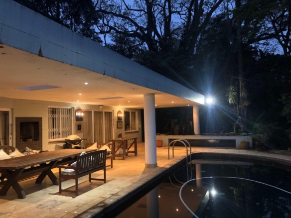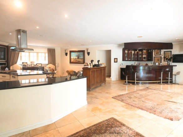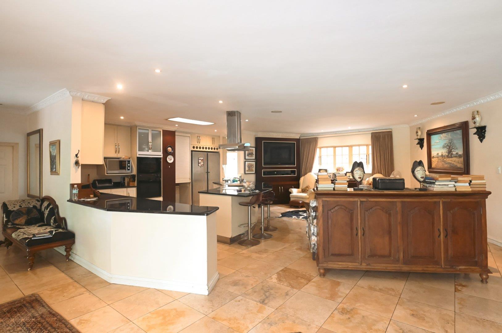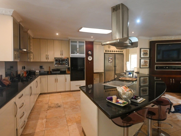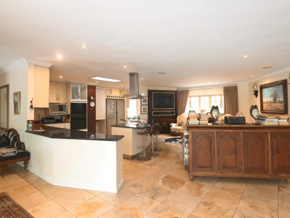 Multiple living areas include a formal lounge, elegant dining room, and a modern open-plan kitchen, all flowing effortlessly to a covered entertainment patio complete with a built-in braai — the perfect setting for poolside gatherings.