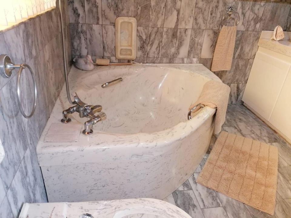 Across the hallway, you have access to a lovely, spacious kitchen with proper wood cupboards, a free-standing electric stove, and a marble finish with a door leading to the outside buildings and garden.