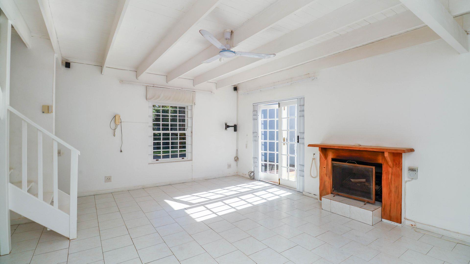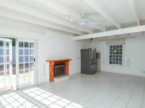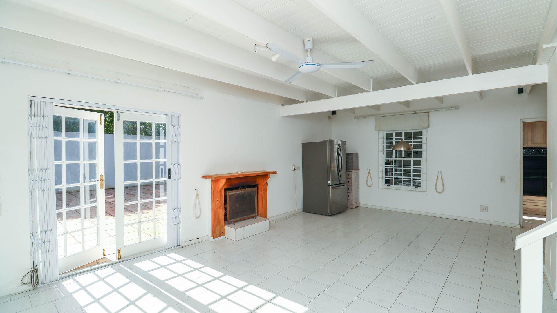 Open plan dining and lounge with wood burning fireplace, ceiling fan and side access to large tiled outdoor terrace with built in braai