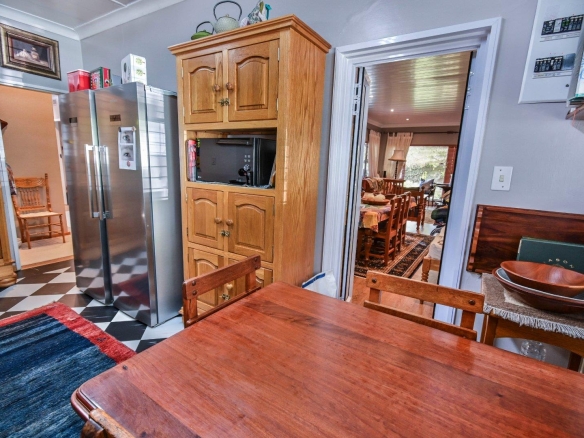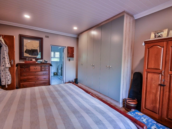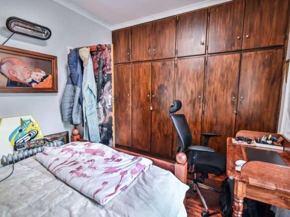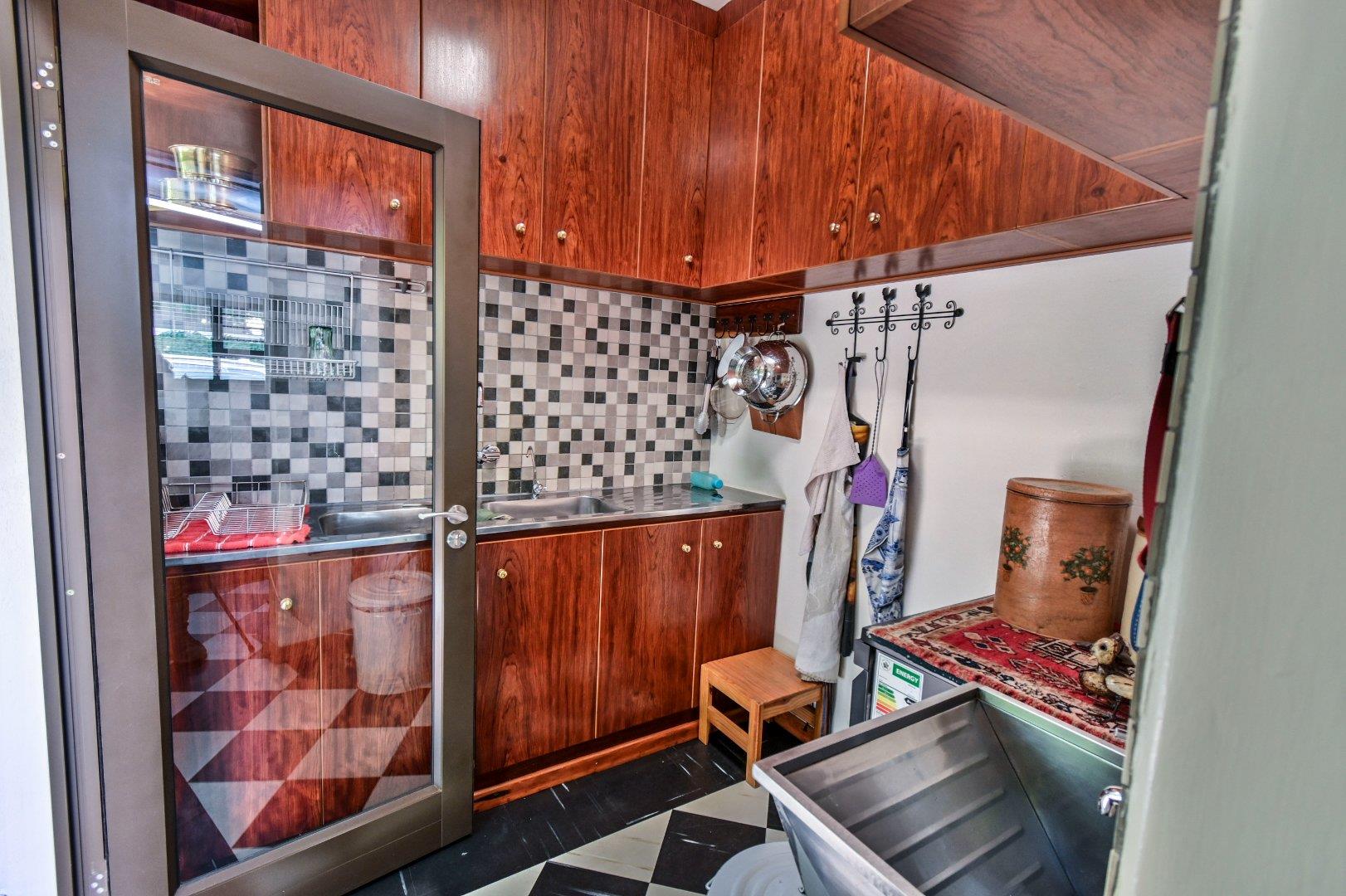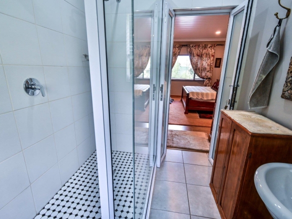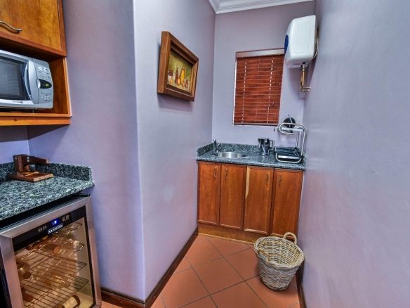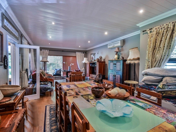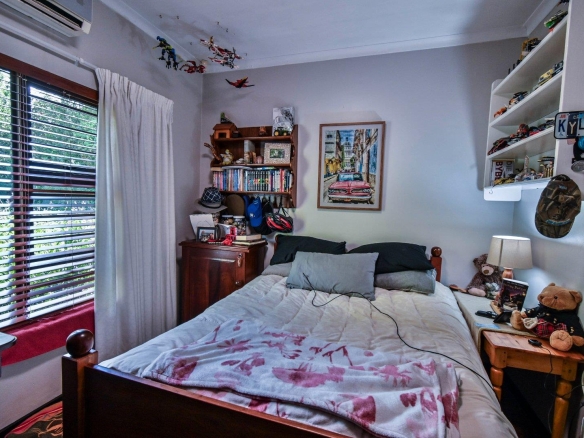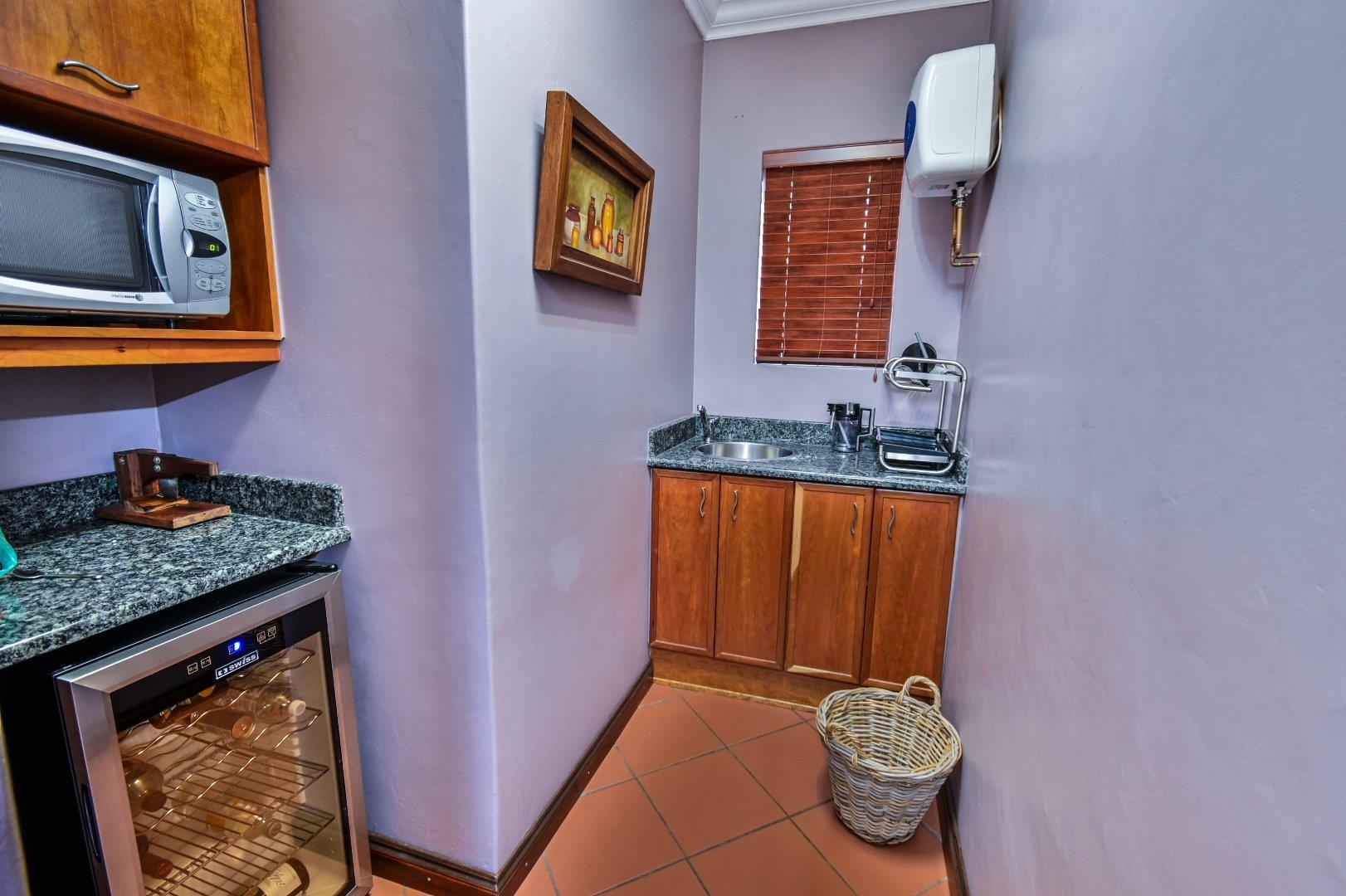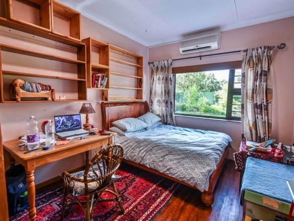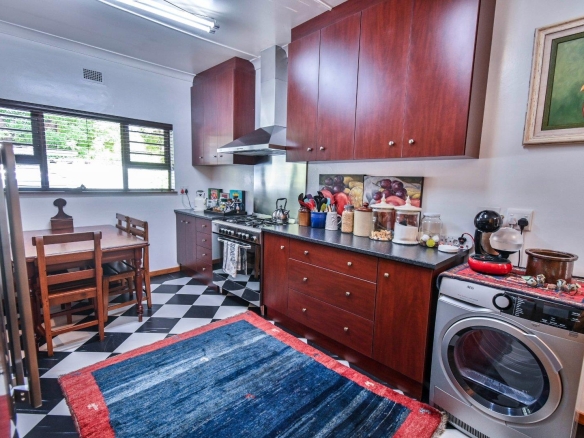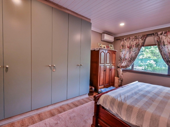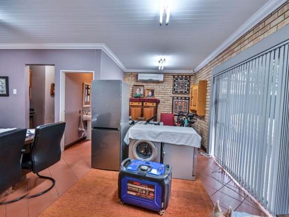 The open-plan dining and living areas are graced with air-conditioning, complemented by a built-in bookshelf with an aluminum door leading to a kitchen adorned with a gas stove, extractor fan, and built-in cupboards. A beautiful separate scullery with ample cupboards and a convenient washing machine connection heightens the kitchen’s allure.