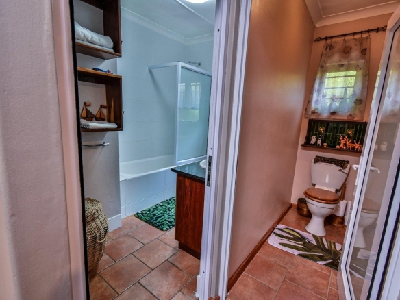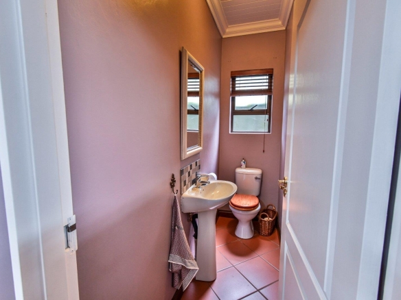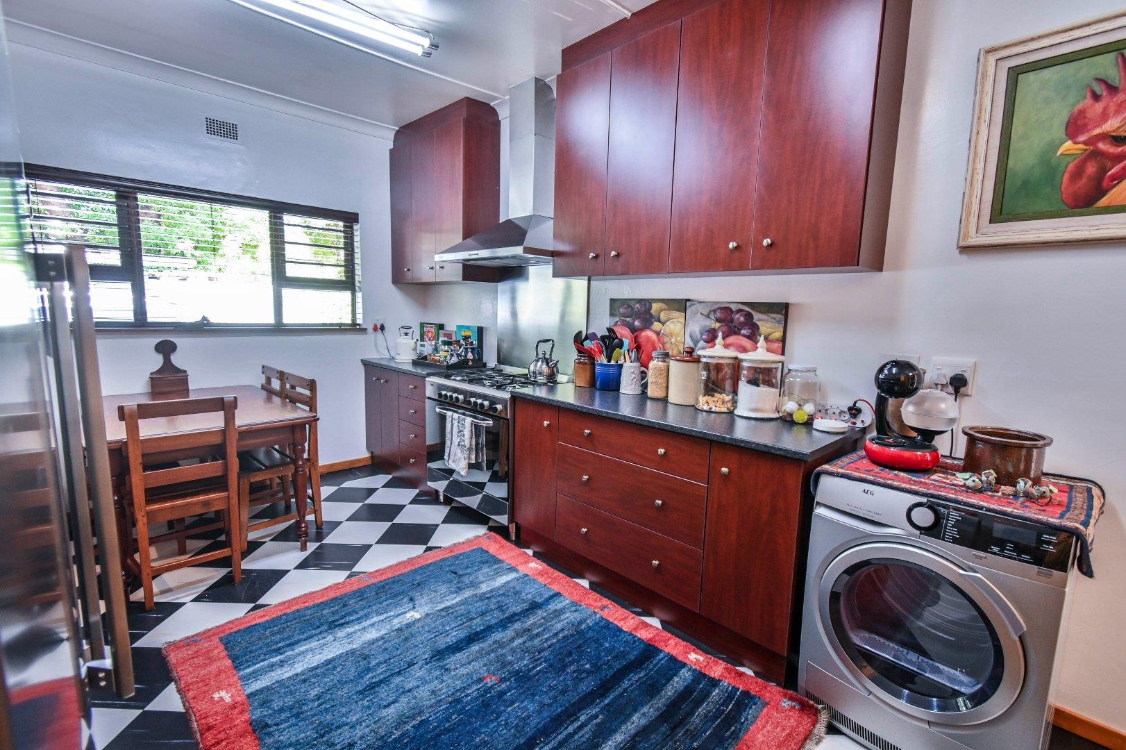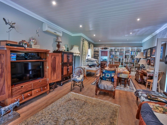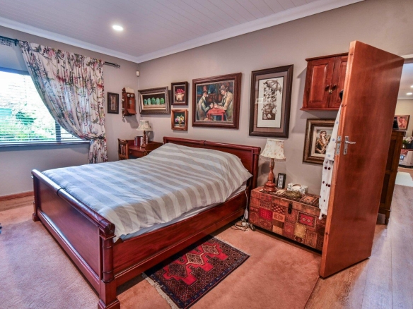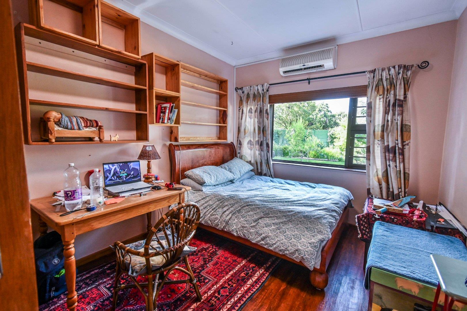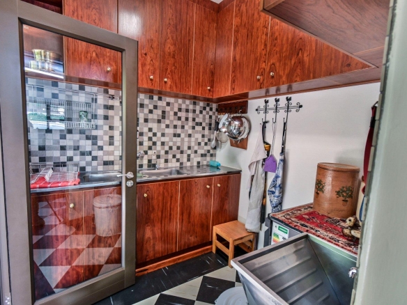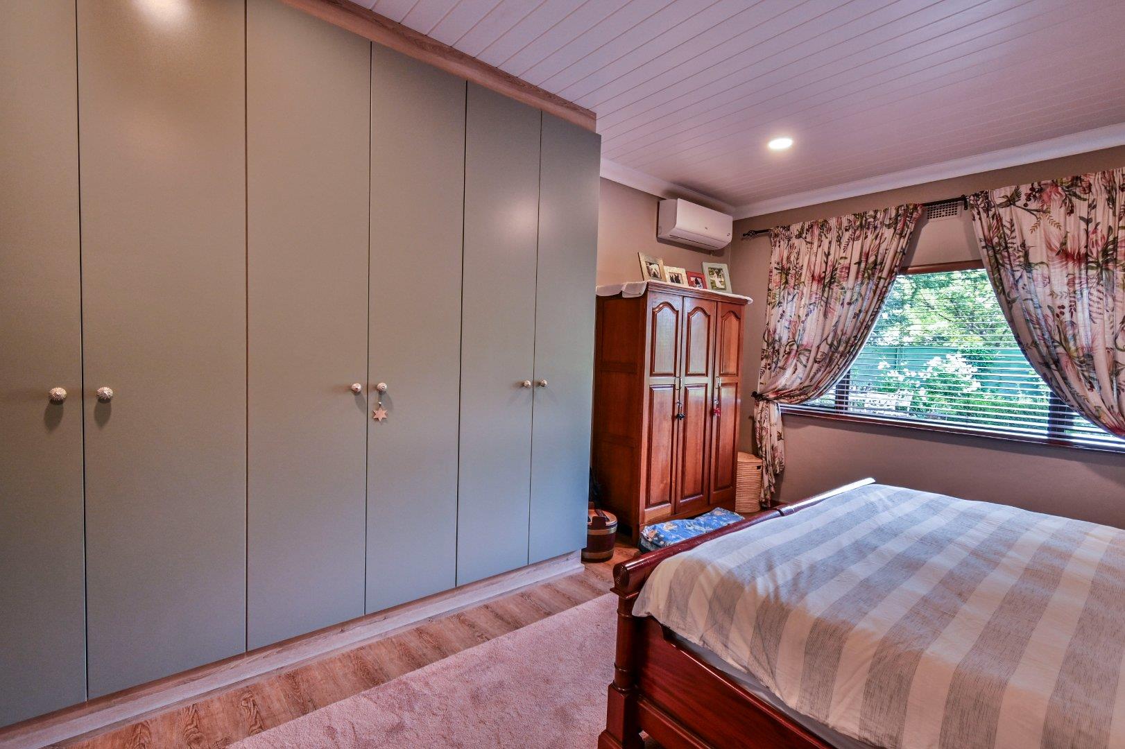 The open-plan dining and living areas are graced with air-conditioning, complemented by a built-in bookshelf with an aluminum door leading to a kitchen adorned with a gas stove, extractor fan, and built-in cupboards. A beautiful separate scullery with ample cupboards and a convenient washing machine connection heightens the kitchen’s allure.