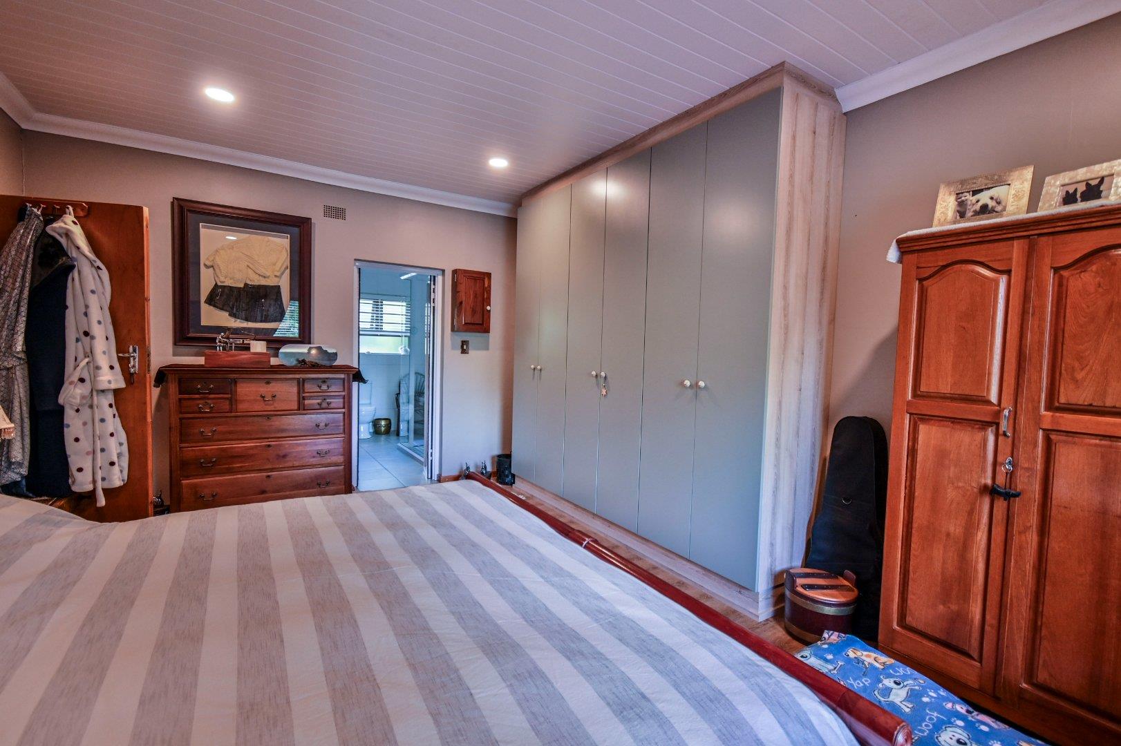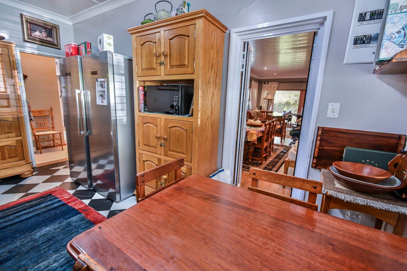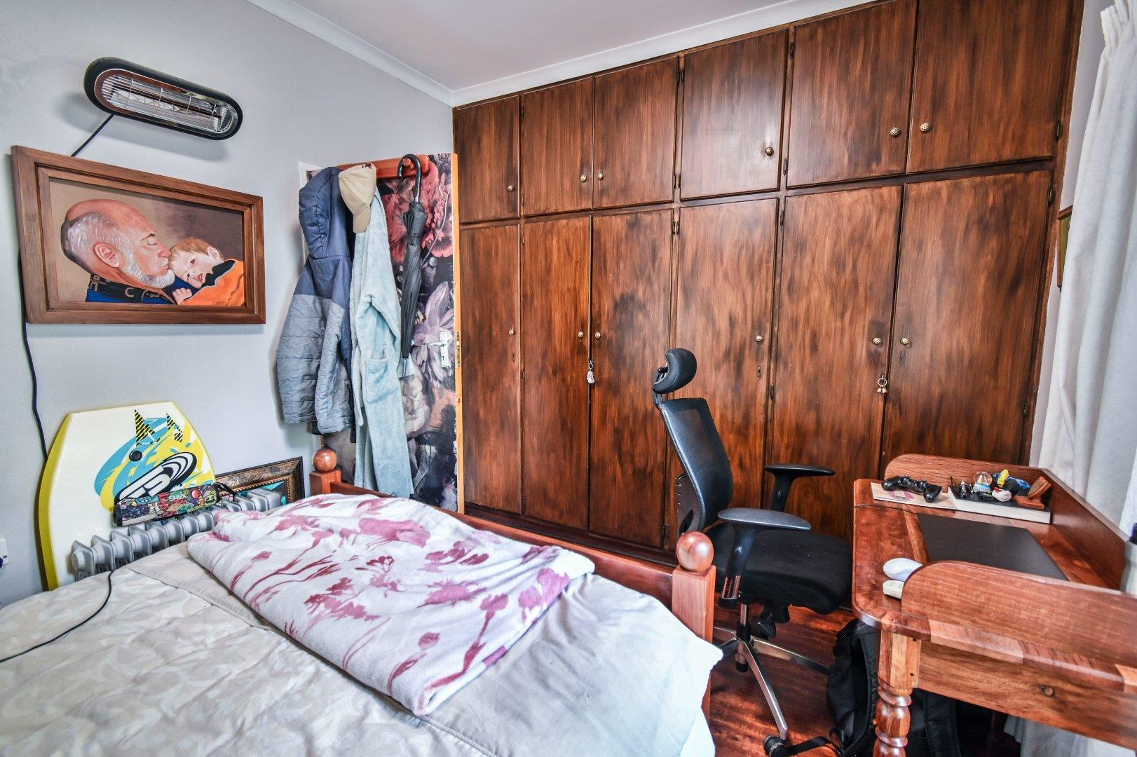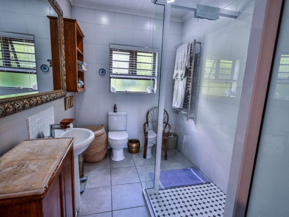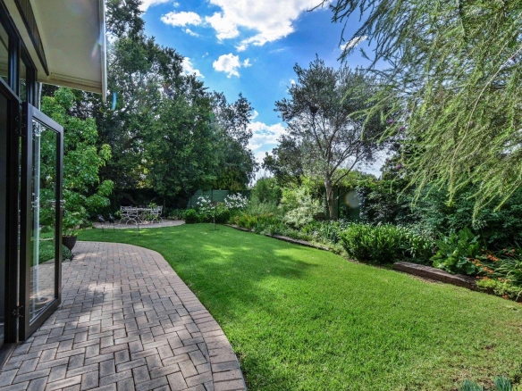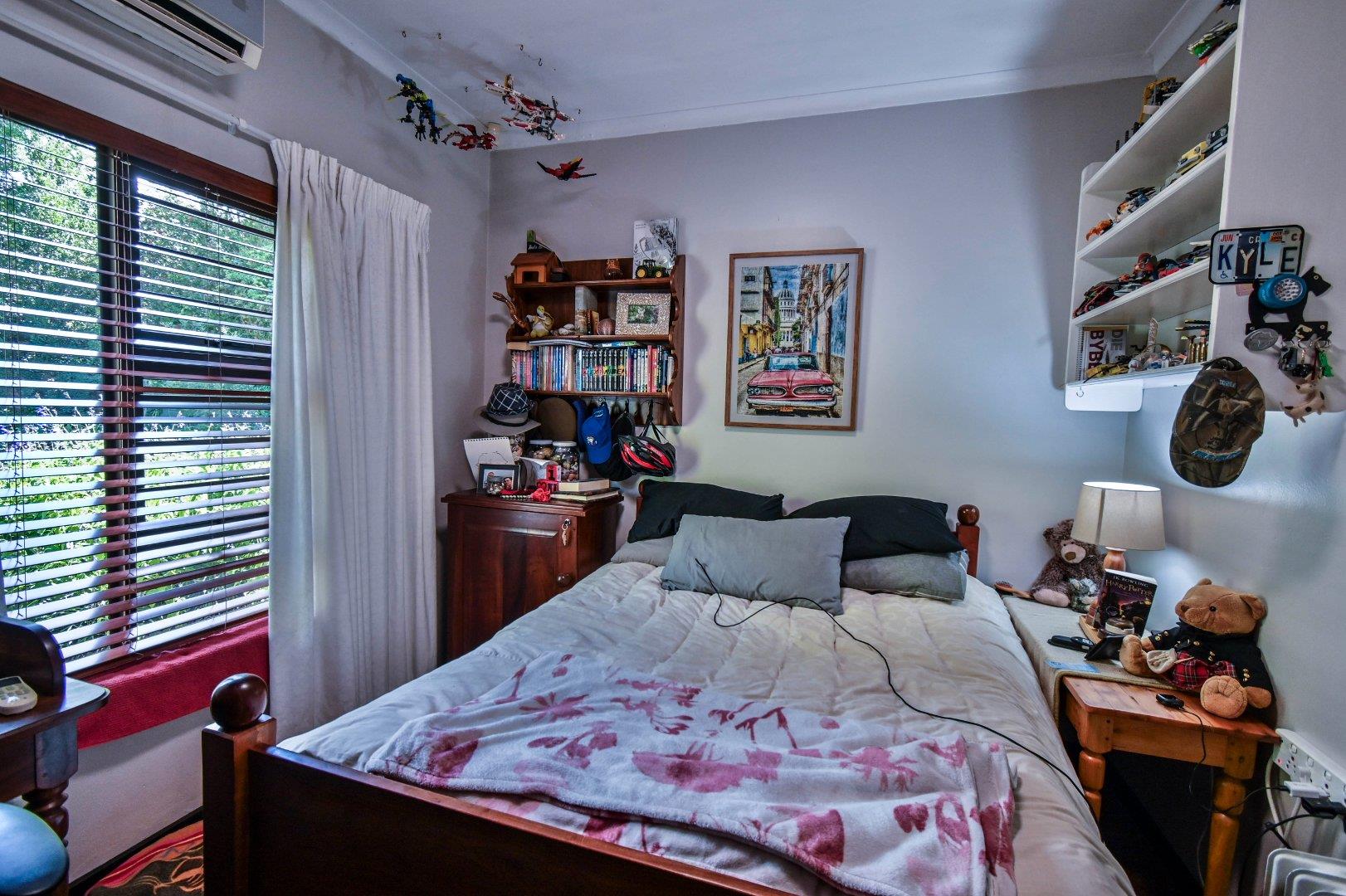 The open-plan dining and living areas are graced with air-conditioning, complemented by a built-in bookshelf with an aluminum door leading to a kitchen adorned with a gas stove, extractor fan, and built-in cupboards. A beautiful separate scullery with ample cupboards and a convenient washing machine connection heightens the kitchen’s allure.