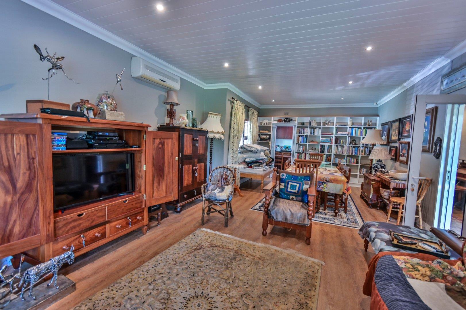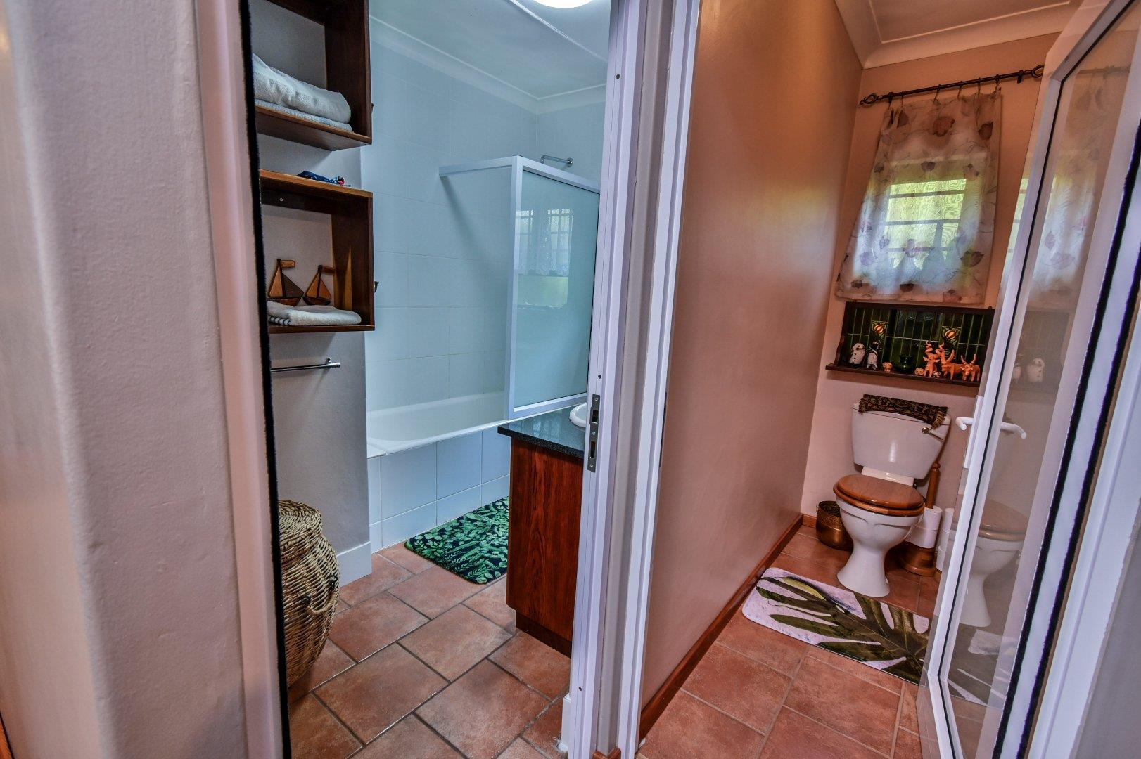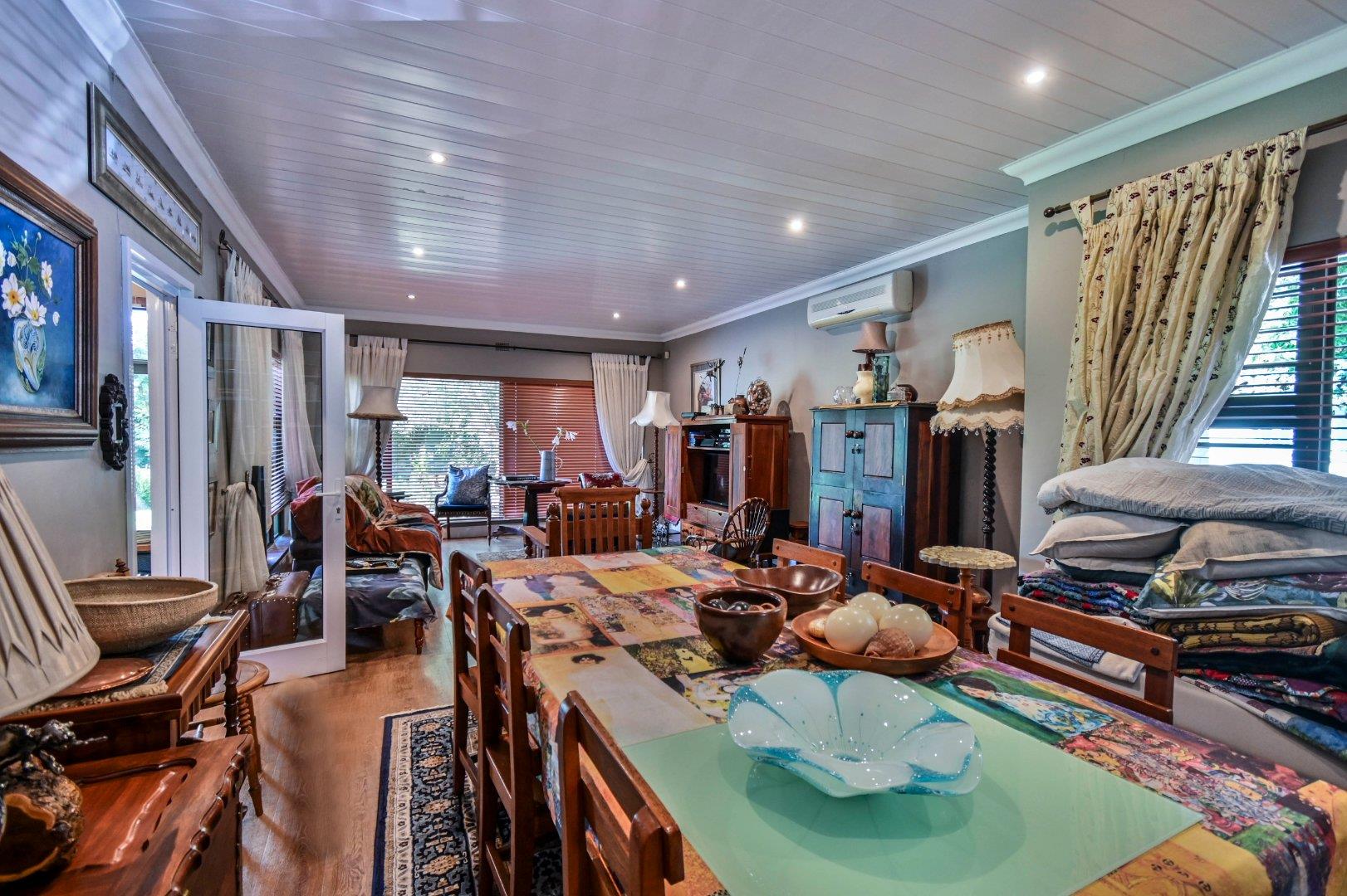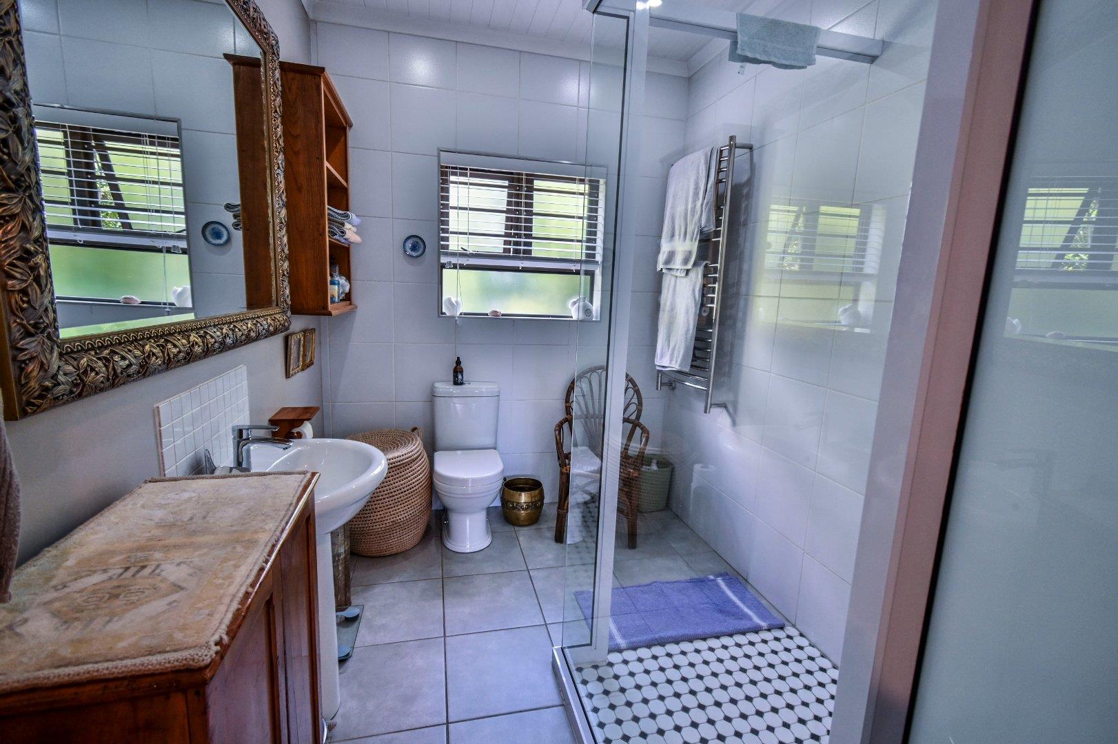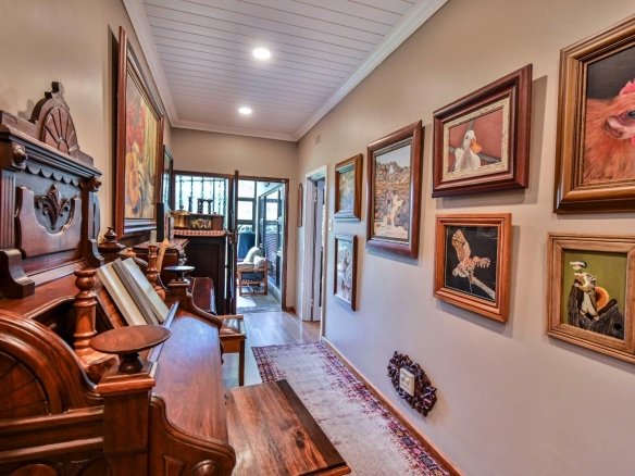 The open-plan dining and living areas are graced with air-conditioning, complemented by a built-in bookshelf with an aluminum door leading to a kitchen adorned with a gas stove, extractor fan, and built-in cupboards. A beautiful separate scullery with ample cupboards and a convenient washing machine connection heightens the kitchen’s allure.