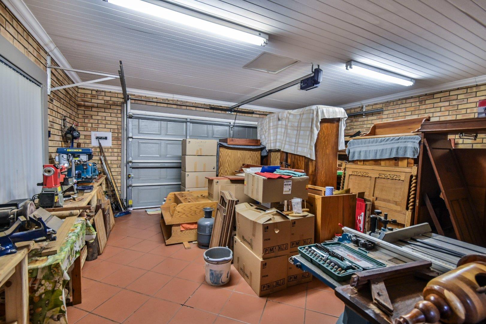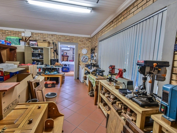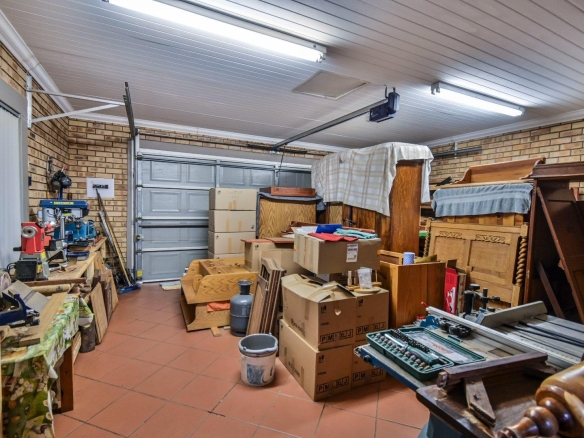 The immaculate double garage, tiled and equipped with a ceiling, boasts an impressive electronic door and a large window, flooding the space with natural light which allows for easy conversion into another flat. An additional outside toilet and paved parking in front of the garage add to the property’s practicality.