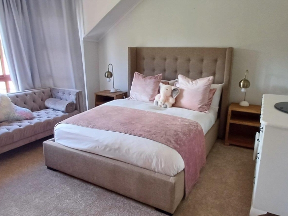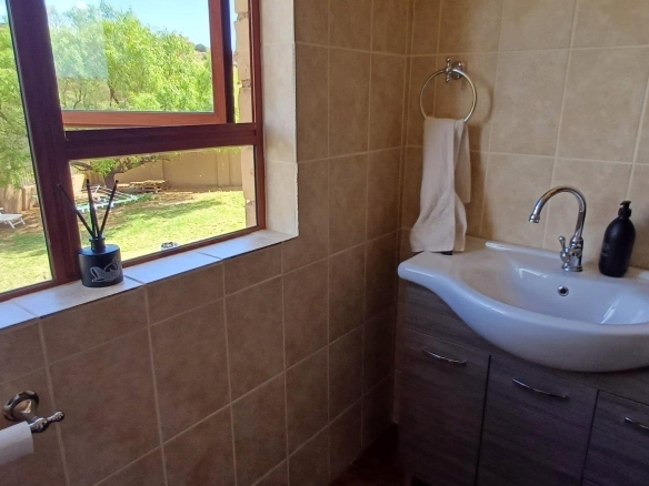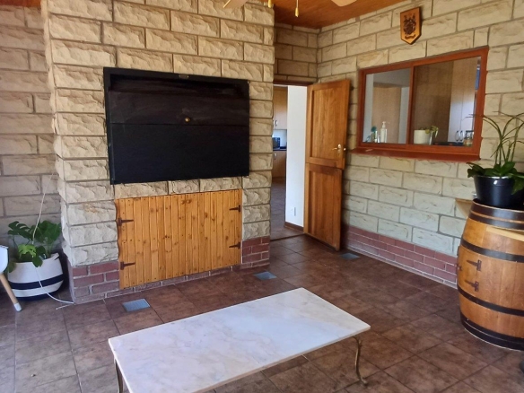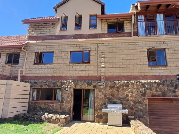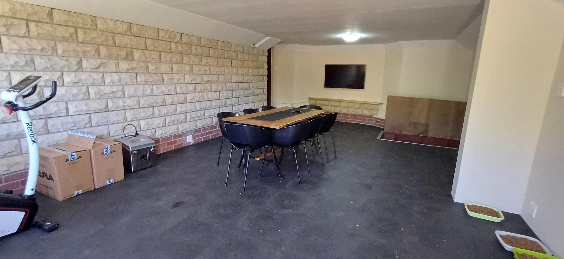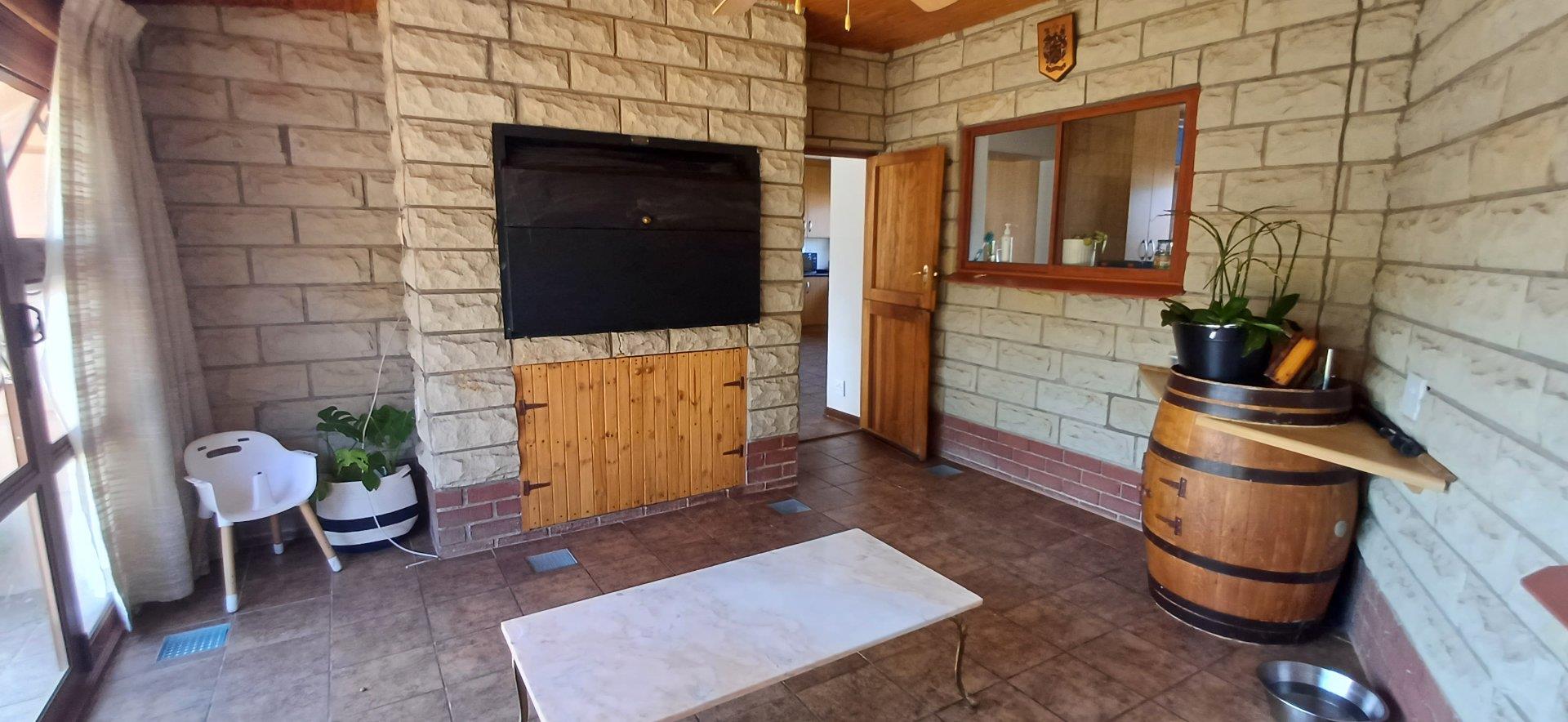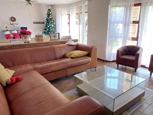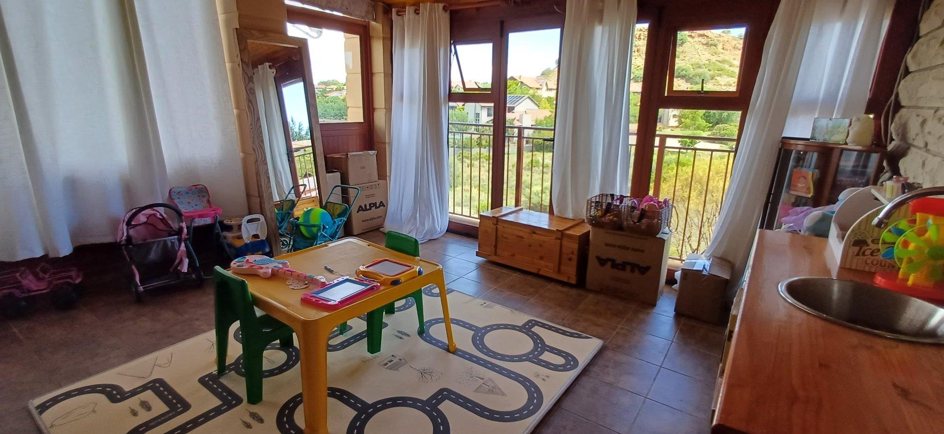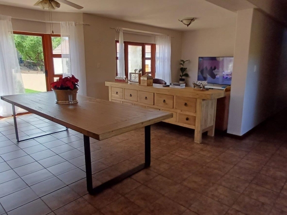 Cozy open-plan living area and a dining area with a fireplace. Big open-plan kitchen and a separate laundry and scullery. It also offers a private braai room with stacked away doors in the garden. Three bedrooms on the first floor and one bedroom on the ground floor. Offers 5 bathrooms. The living area on the first floor is currently used as a room but can also work as a study or another bedroom.