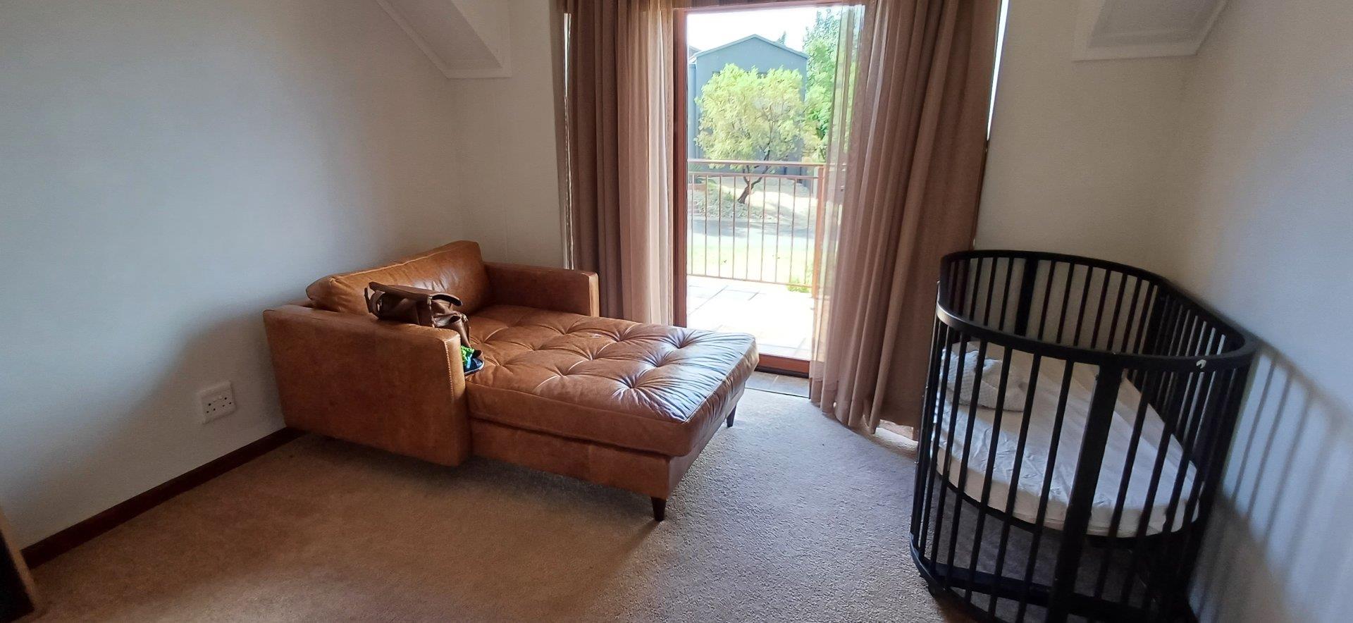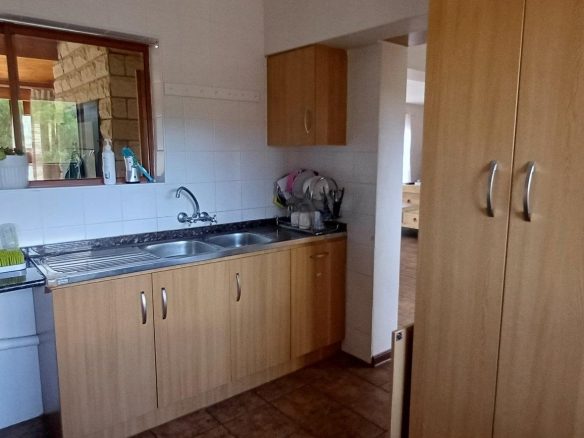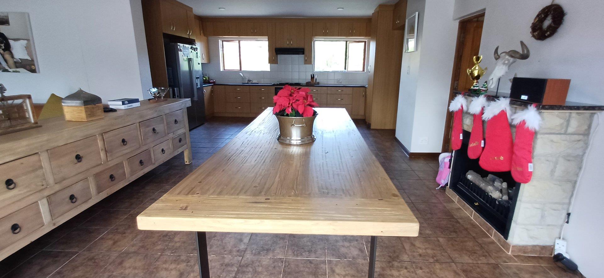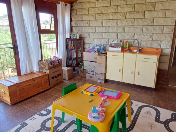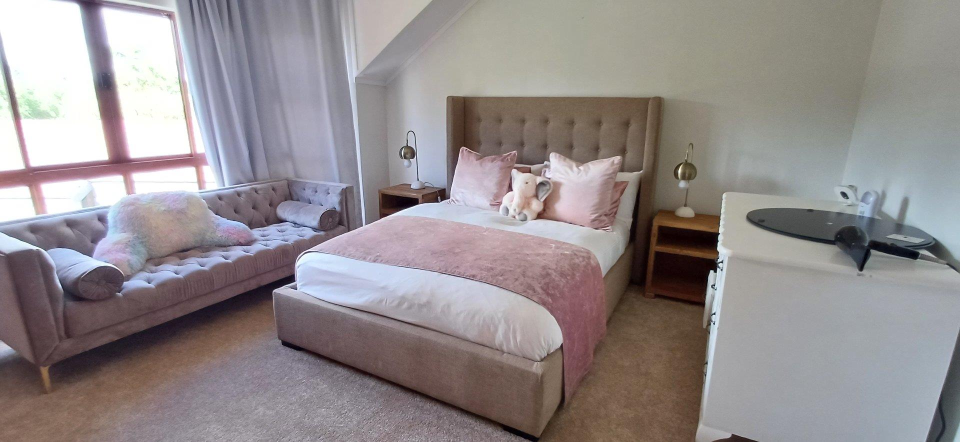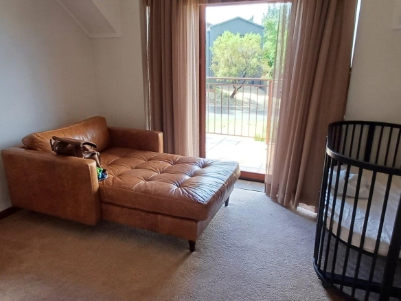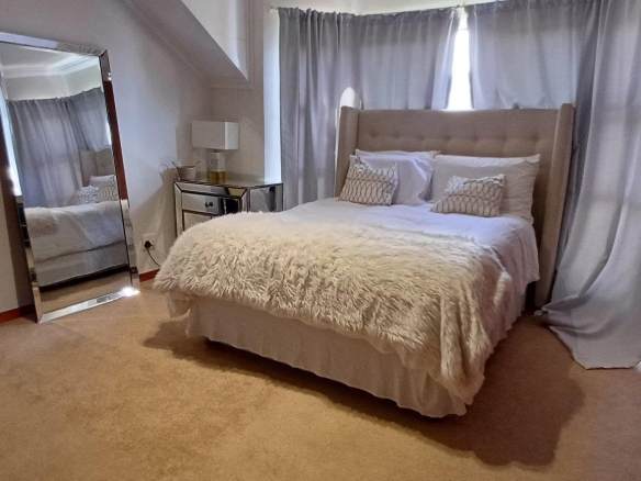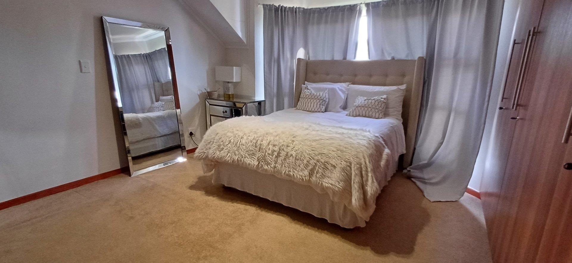 Cozy open-plan living area and a dining area with a fireplace. Big open-plan kitchen and a separate laundry and scullery. It also offers a private braai room with stacked away doors in the garden. Three bedrooms on the first floor and one bedroom on the ground floor. Offers 5 bathrooms. The living area on the first floor is currently used as a room but can also work as a study or another bedroom.