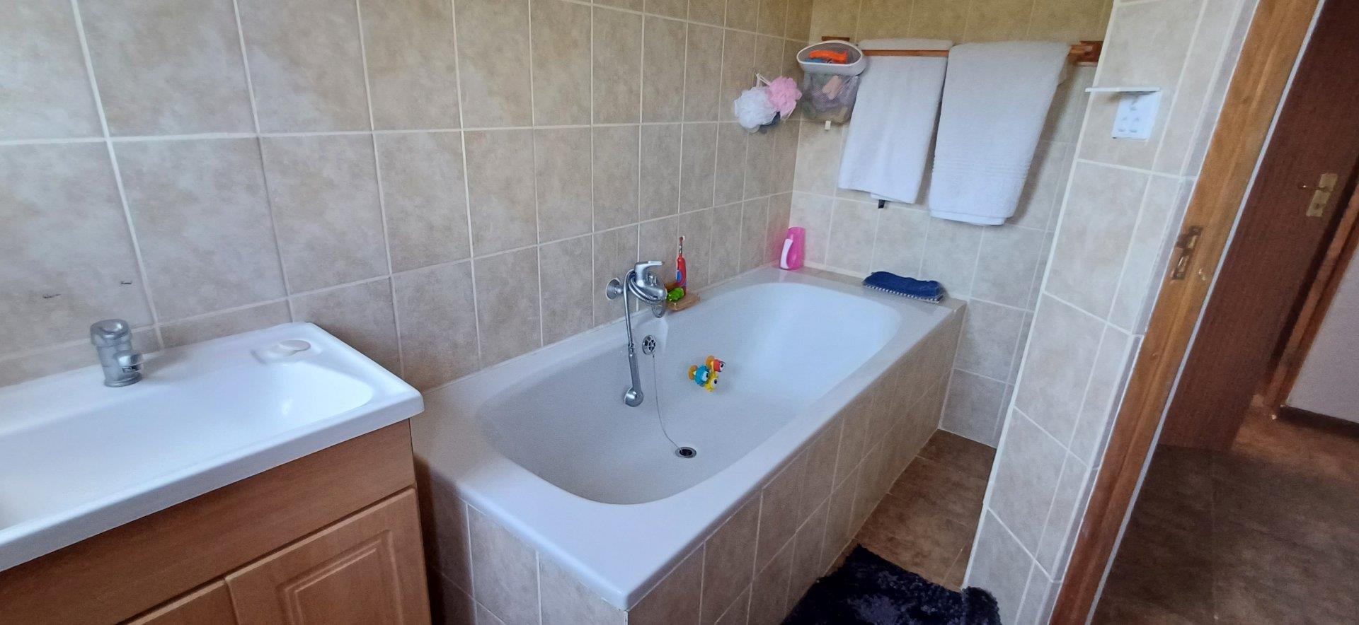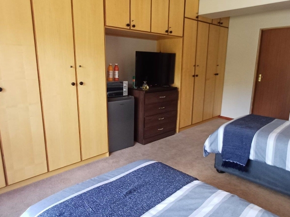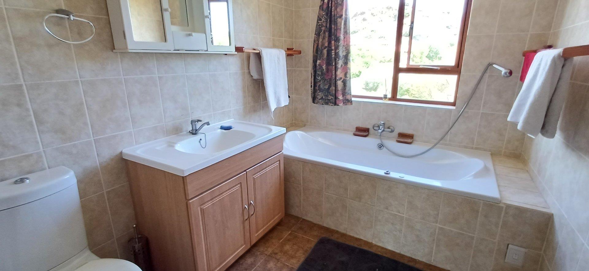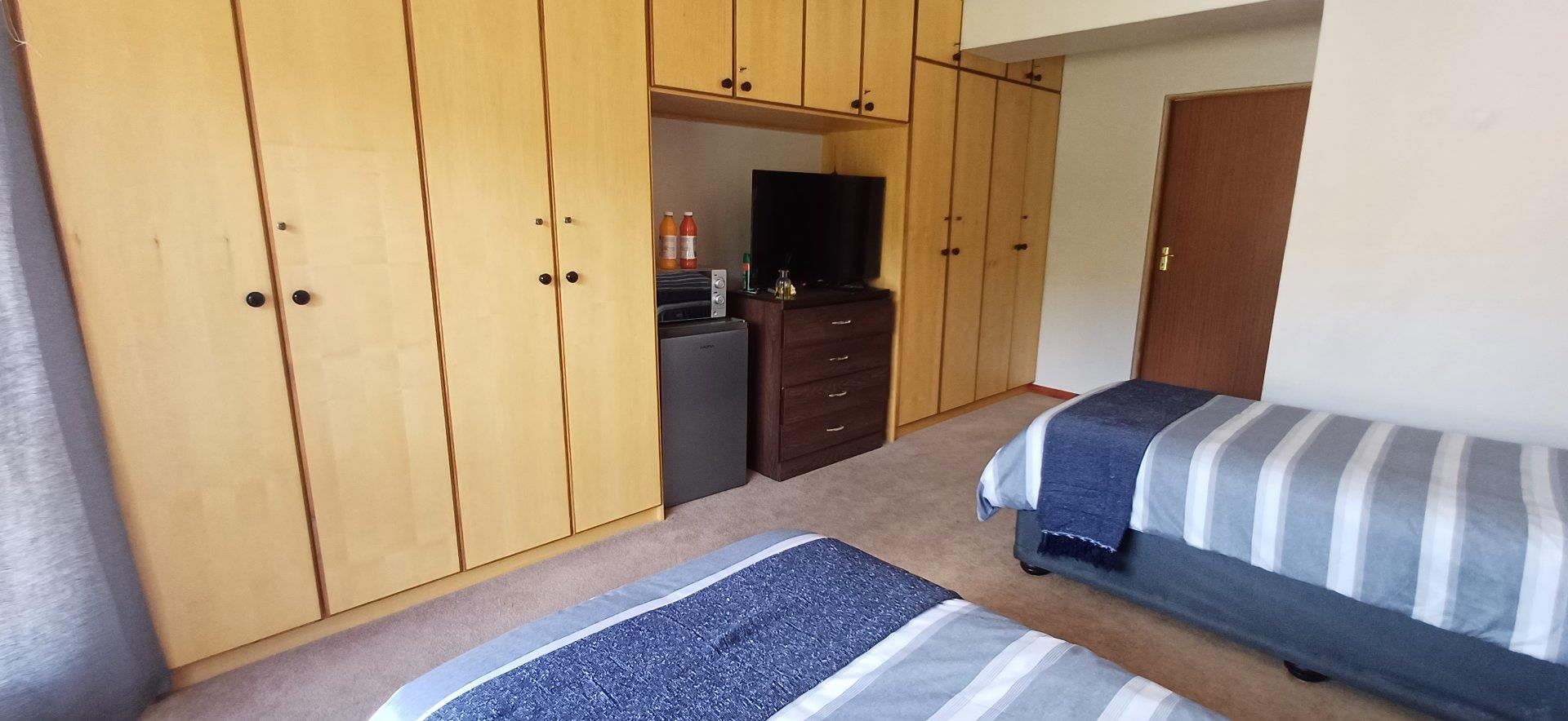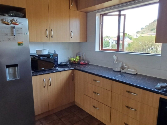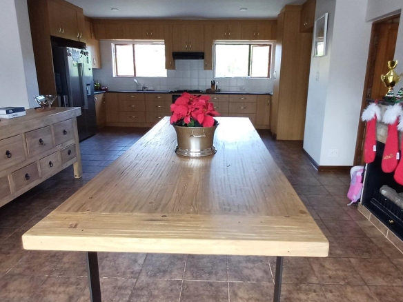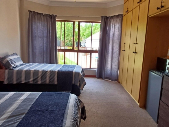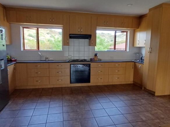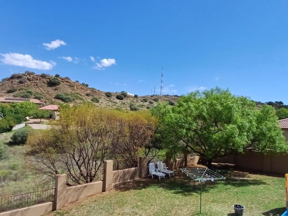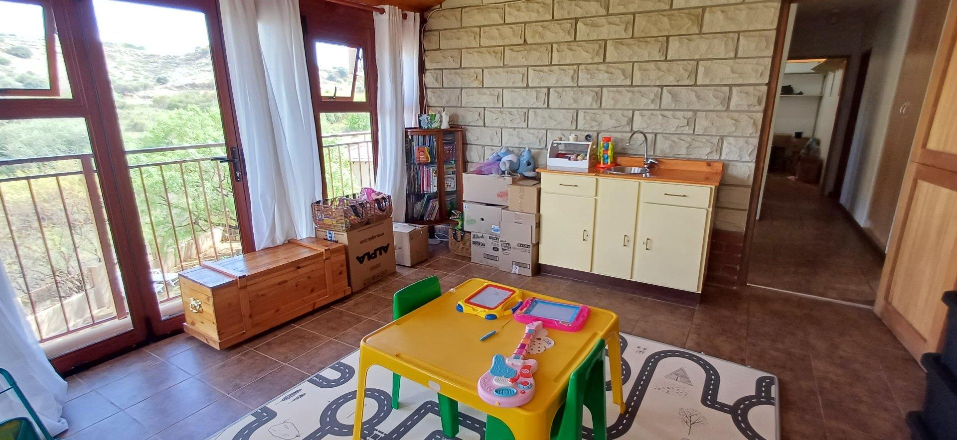 Cozy open-plan living area and a dining area with a fireplace. Big open-plan kitchen and a separate laundry and scullery. It also offers a private braai room with stacked away doors in the garden. Three bedrooms on the first floor and one bedroom on the ground floor. Offers 5 bathrooms. The living area on the first floor is currently used as a room but can also work as a study or another bedroom.