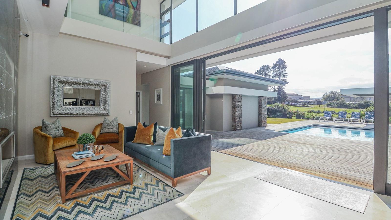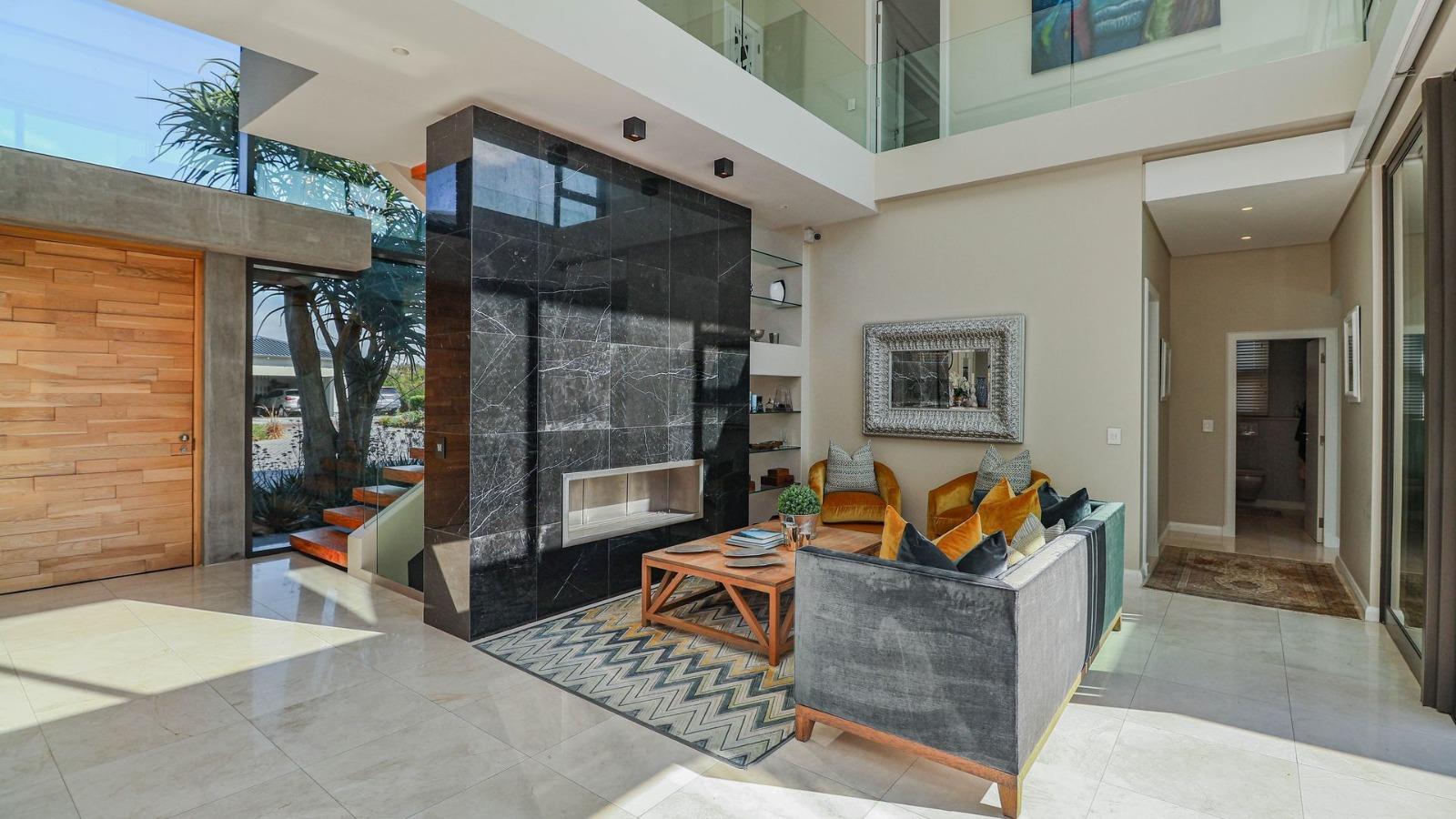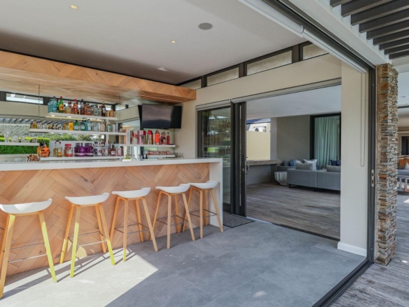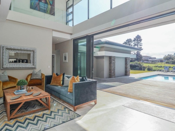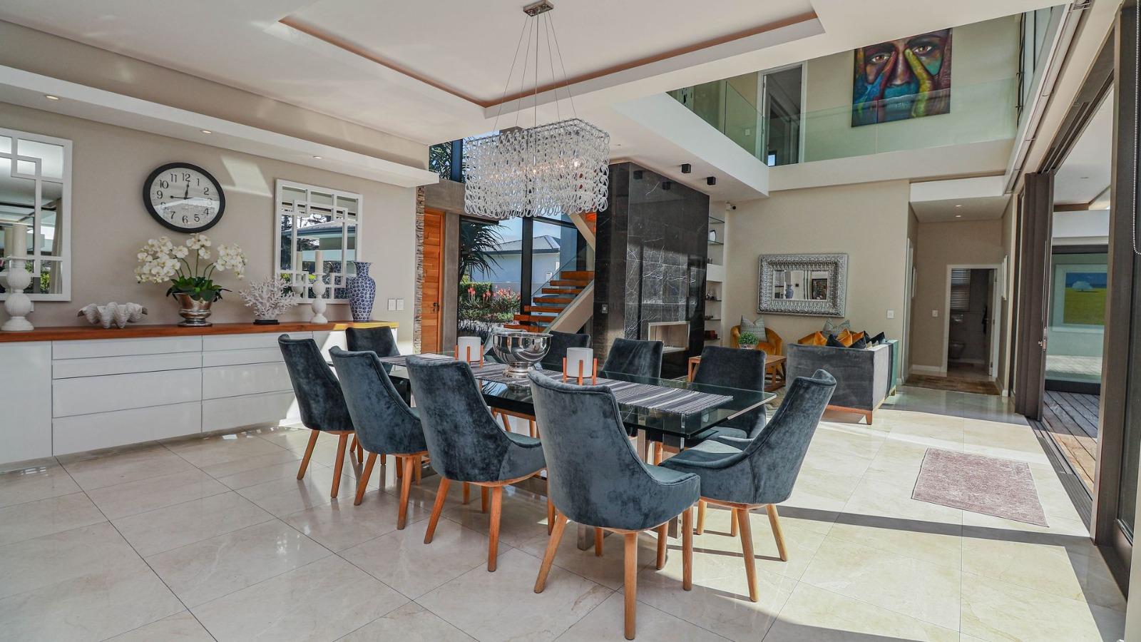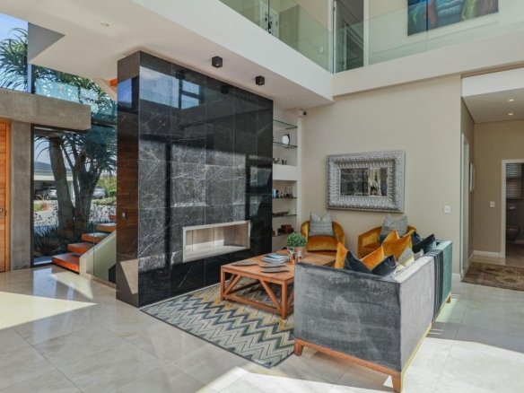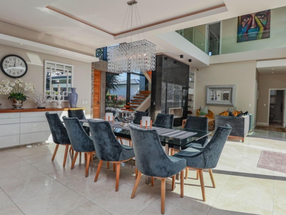 Situated in a breathtaking location, this upmarket home offers a perfect blend of luxury, comfort, and entertainment. As one steps through the large doorway into the welcoming foyer of this luxurious home, you’ll be greeted by double volume open and spacious living areas that boast a modern and stylish design. The high ceilings and large windows allow natural light to flood the space, creating a warm and inviting atmosphere. The living areas seamlessly flow into the dining area and a state-of-the-art kitchen, making it easy to entertain guests whilst preparing or having a sumptuous meal prepared.