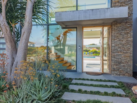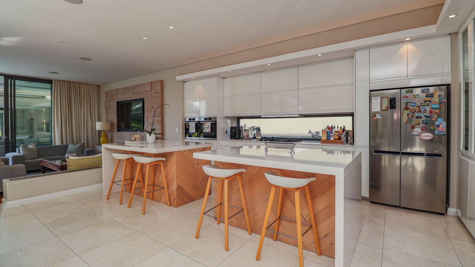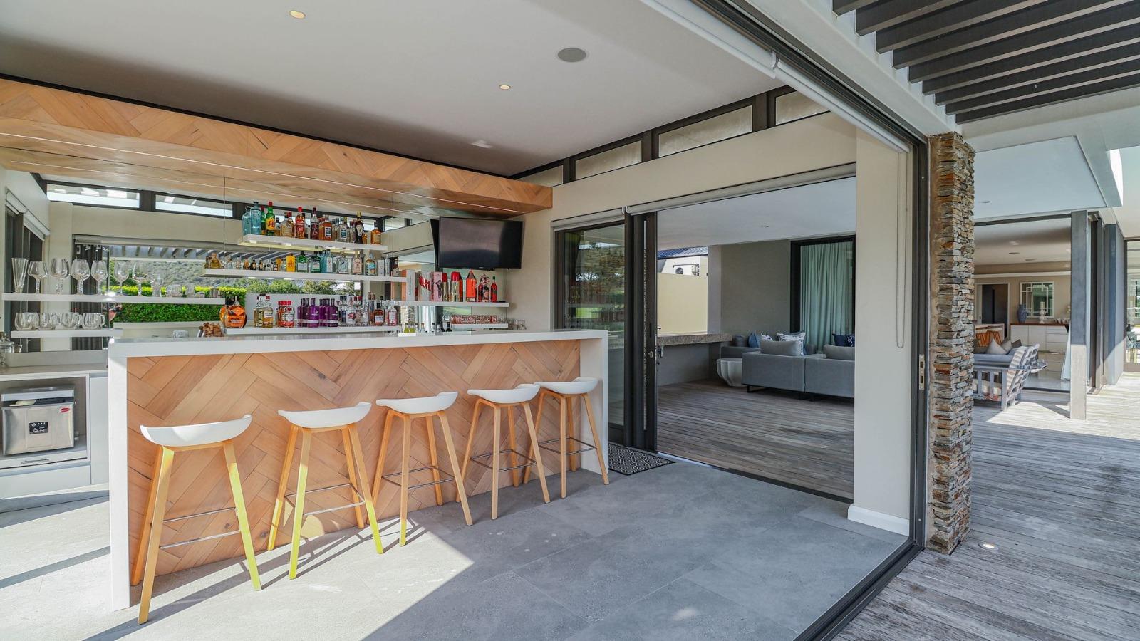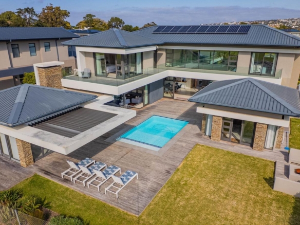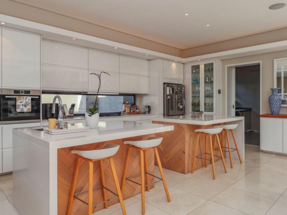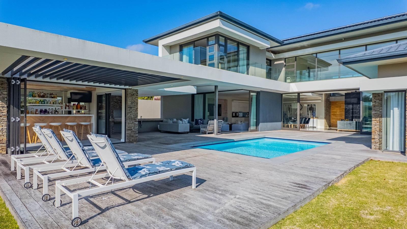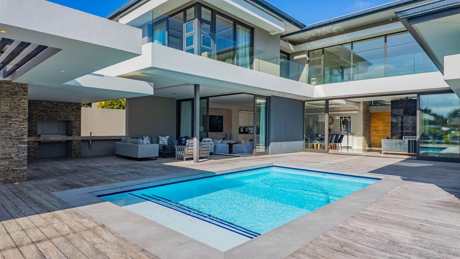 Situated in a breathtaking location, this upmarket home offers a perfect blend of luxury, comfort, and entertainment. As one steps through the large doorway into the welcoming foyer of this luxurious home, you’ll be greeted by double volume open and spacious living areas that boast a modern and stylish design. The high ceilings and large windows allow natural light to flood the space, creating a warm and inviting atmosphere. The living areas seamlessly flow into the dining area and a state-of-the-art kitchen, making it easy to entertain guests whilst preparing or having a sumptuous meal prepared.