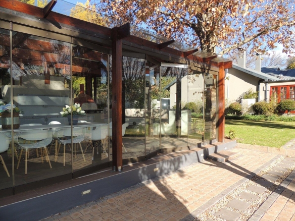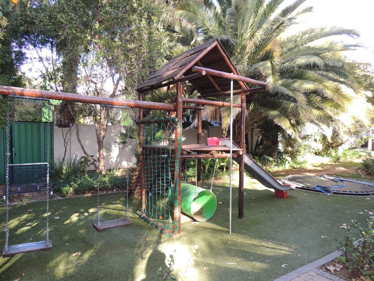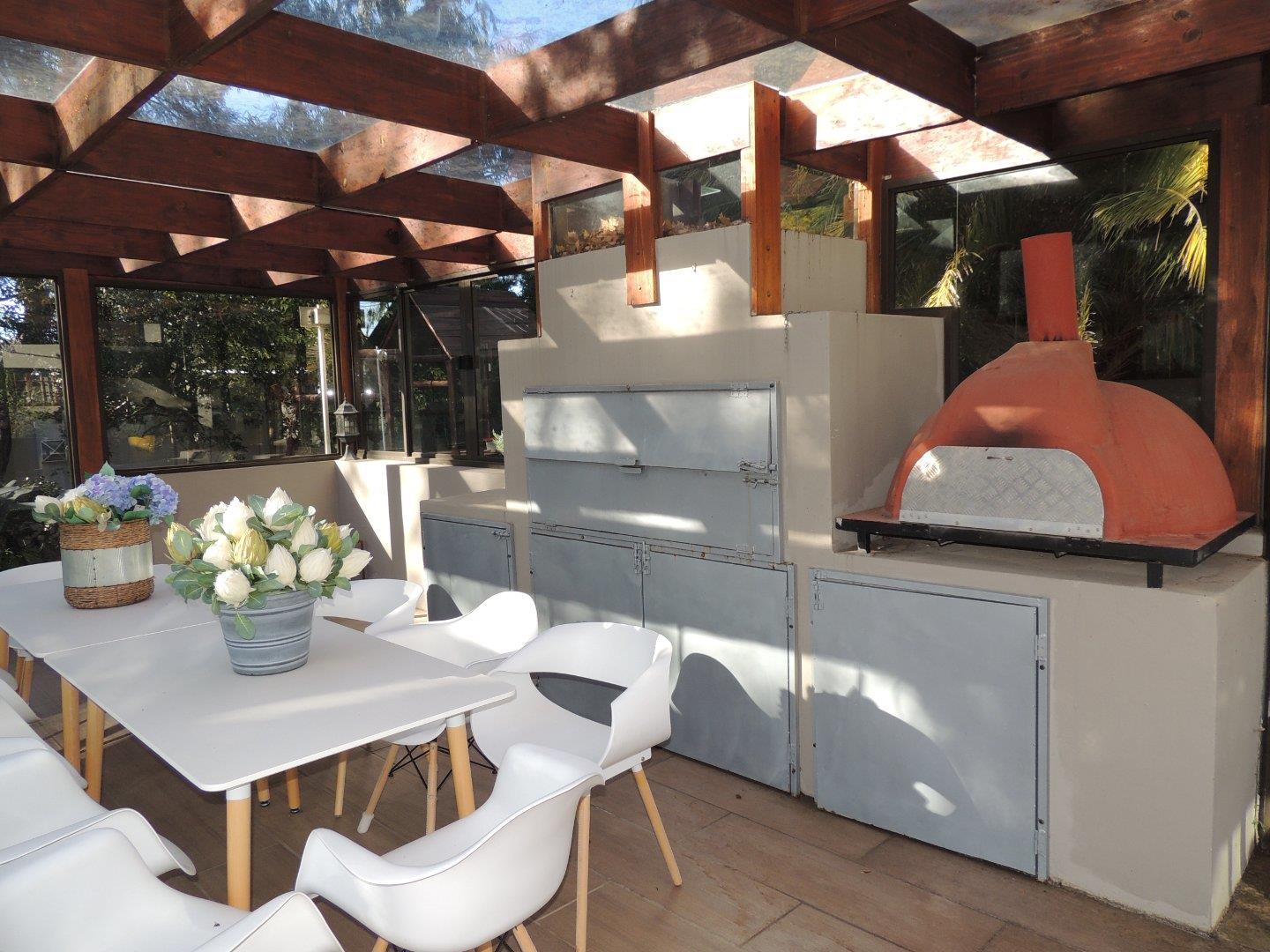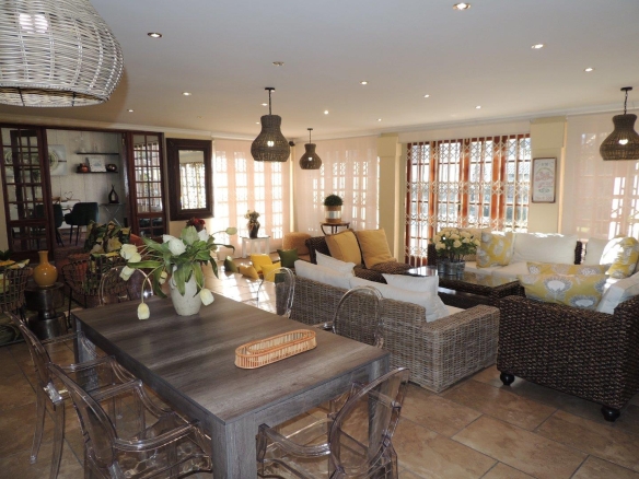 For those with a passion for entertaining, this home leaves no stone unturned. The well-appointed gourmet kitchen is a culinary masterpiece, equipped with top-of-the-line appliances, custom cabinetry, and a large centre island perfect for hosting intimate gatherings or preparing exquisite feasts. Adjacent to the kitchen, a formal dining room next to a large bar and built-in braai awaits, creating a refined atmosphere for special occasions. There is also a separate family room with a private office that looks out onto the pool and garden. As you step outside, a meticulously landscaped garden surrounds a sparkling swimming pool, creating a tranquil retreat for relaxation and leisure. Whether you prefer soaking up the sun on the expansive patio or enjoying alfresco dining with loved ones, inside the outdoor glass-enclosed dining space, the outdoor living spaces of this property are designed to accommodate your every desire – even sundowners around a BOMA fire.
