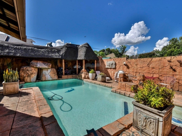 Indulge in the irresistible charm of this expansive and meticulously designed family residence. Beyond the swivel door lies an inviting entrance hall, unveiling a generous living room on the right that seamlessly transitions into a well-crafted built-in bar with ample cupboard space, an indoor braai area, and an adjoining captivating pool oasis.