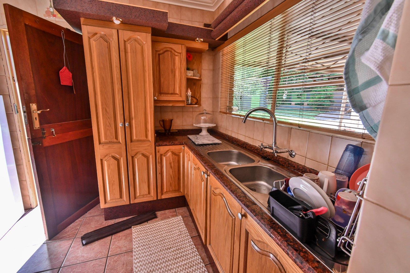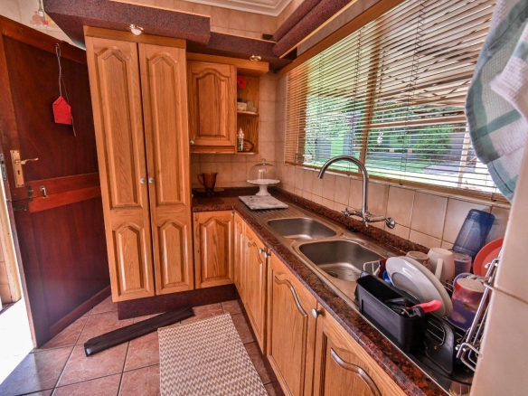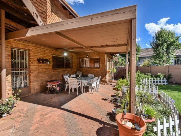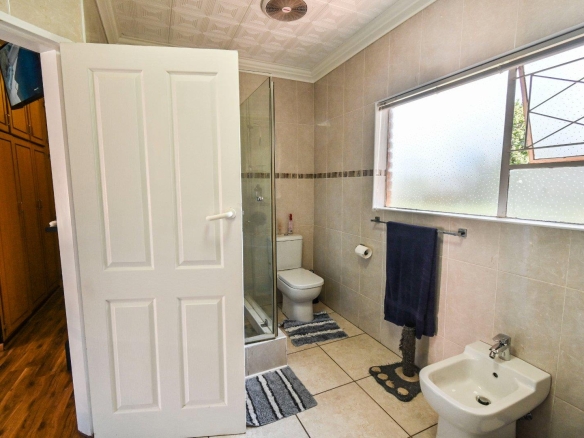 To the left of the entrance hall awaits a dining area connected to a superbly equipped kitchen featuring abundant cabinets, an eye-level oven, a hob with an extractor fan, and a separate scullery, laundry, and breakfast room. Venture down the passage to discover a full bathroom, a laminate-floored bedroom currently used as an office, two carpeted bedrooms, a master bedroom with laminated flooring, a walk-in closet an en-suite full bathroom that opens to the enticing swimming pool.