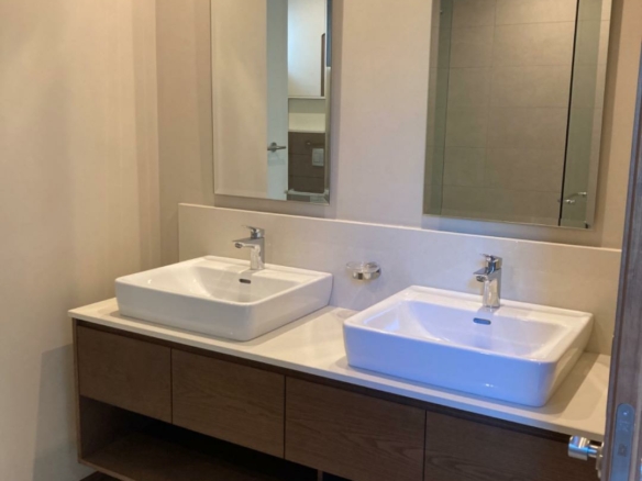 The master bedroom is a serene retreat featuring an ensuite bathroom, providing a private sanctuary for relaxation and rejuvenation. The additional two bedrooms are generously sized and share a well-appointed bathroom, ensuring comfort and convenience for family and guests. A dedicated laundry room adds to the practicality of this well-designed apartment.
