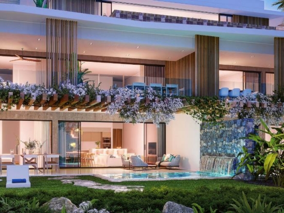 Welcome to an exquisite ground-floor apartment that seamlessly combines indoor and outdoor living in perfect harmony. Step outside onto your private garden oasis, where you’ll find a delightful dipping pool, the ideal setting for a refreshing cocktail while being captivated by the mesmerizing sunset views.