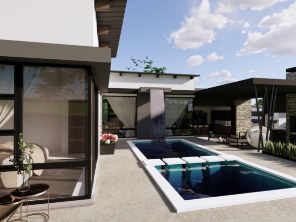 An outdoor entertainment area , covered with a build in braai facility and an outdoor kitchen, any entertainers dream overlooking your crystal clear pool (available as an optional upgrade) forms part of the bushveld scene and Africa’s sunset hue’s paints a different picture every sunset