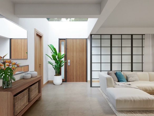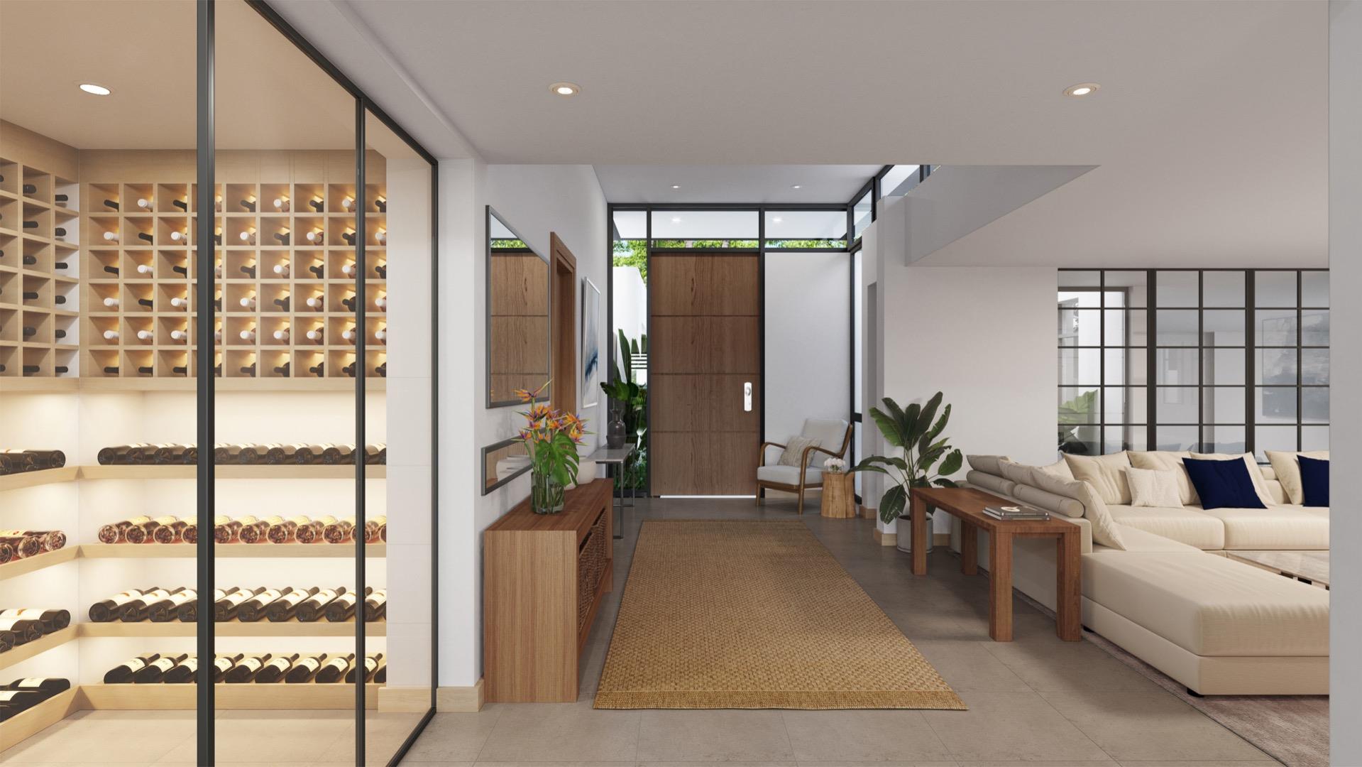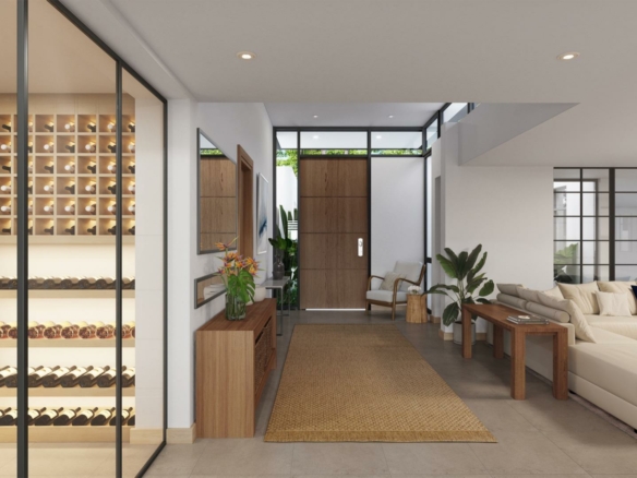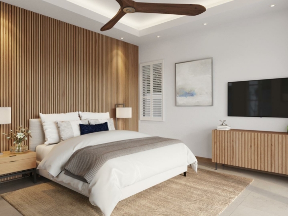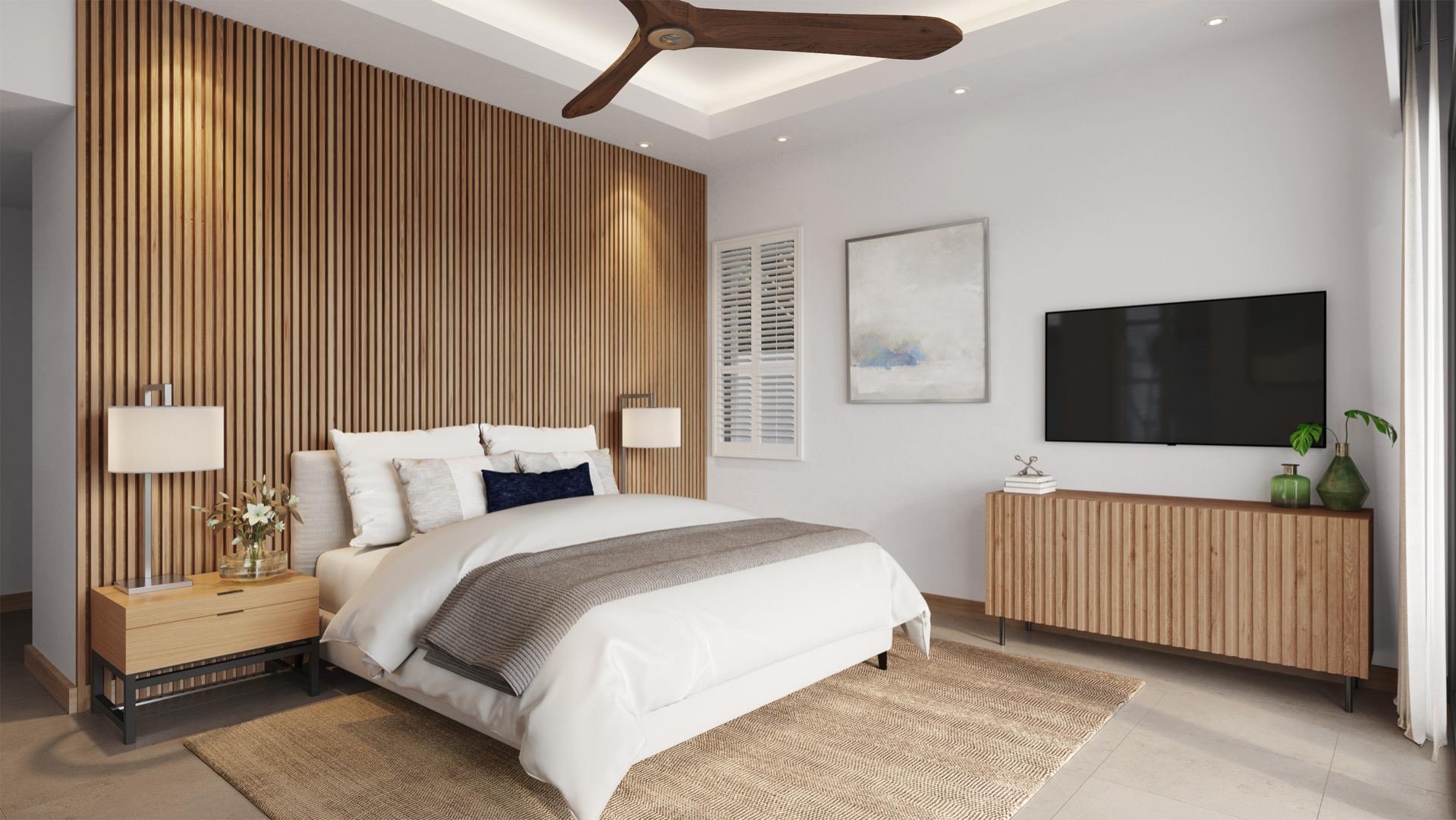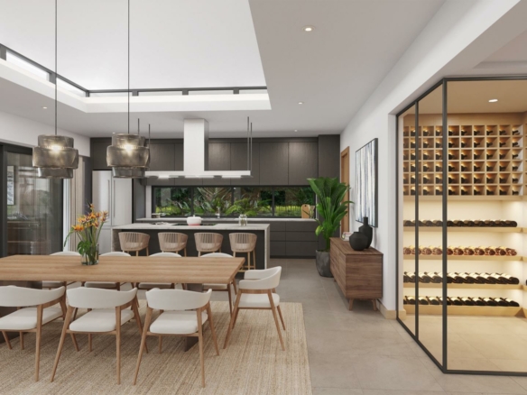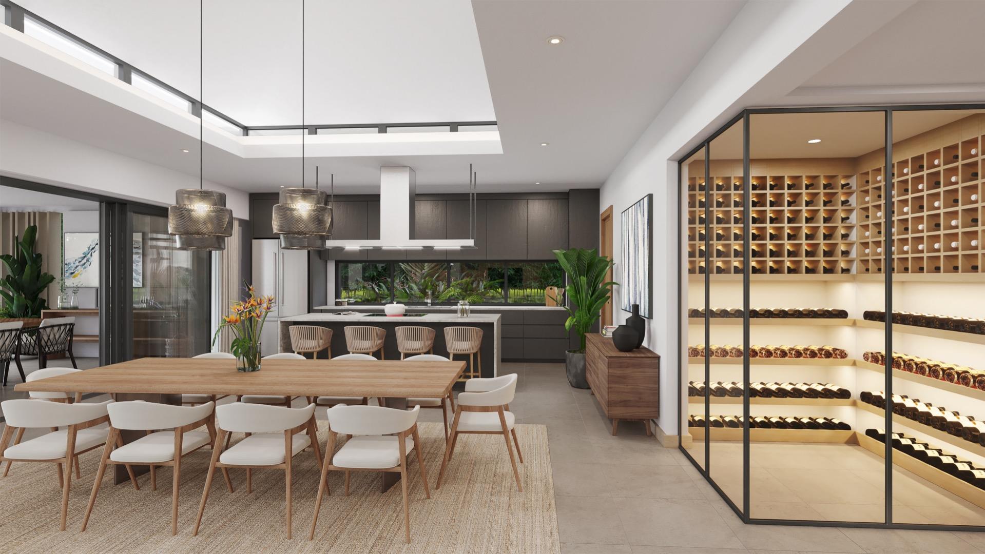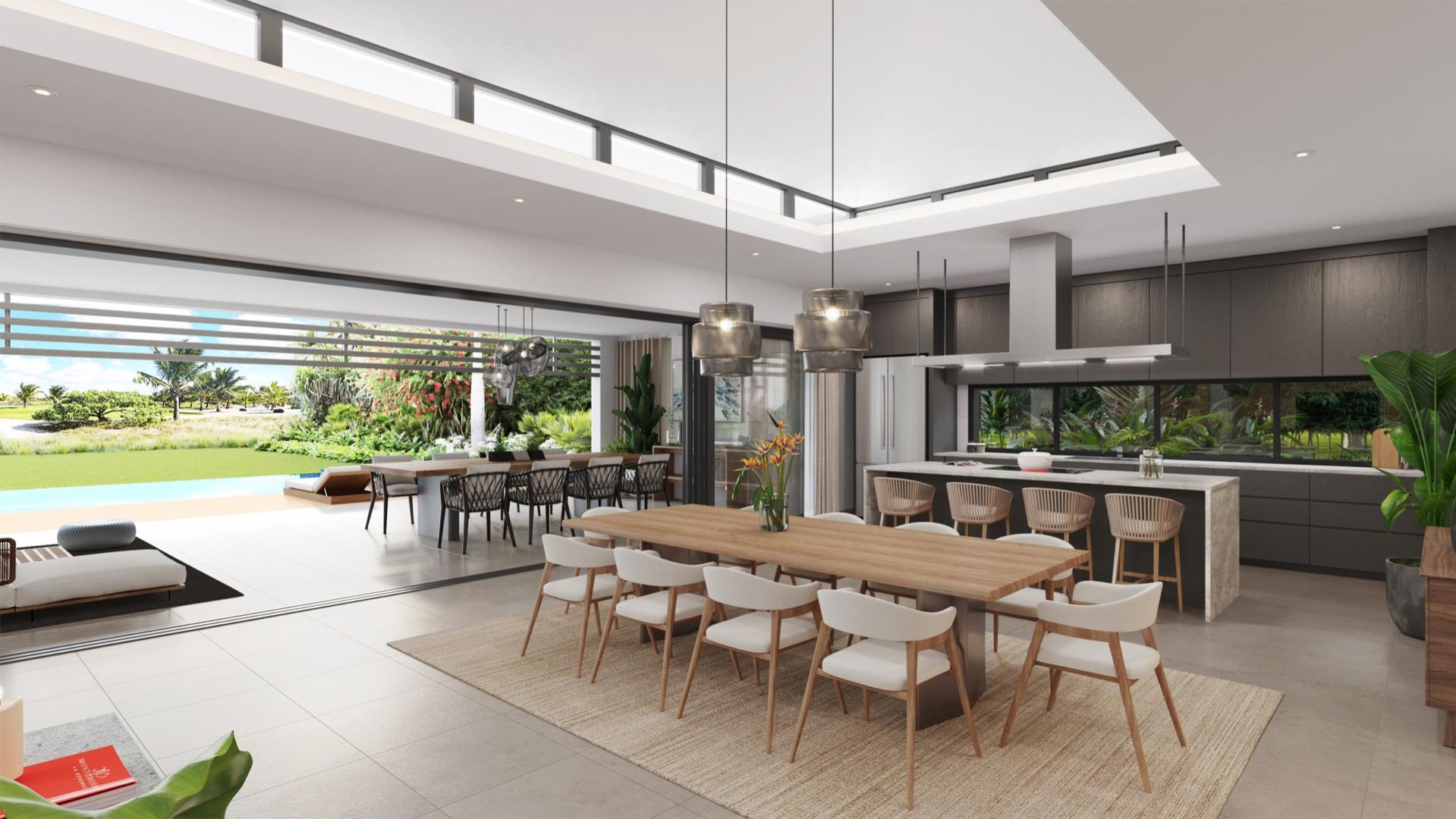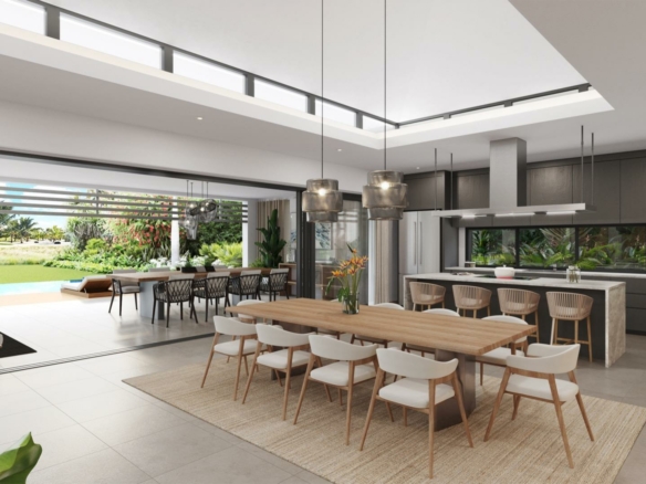 These luxurious villas showcase a captivating blend of contemporary Mauritian architecture. Surrounded by lush tropical landscapes, these refined residences provide expansive indoor and outdoor living spaces. The interior design is a testament to quiet sophistication, appealing to homeowners who seek both elegance and contemporary style. A neutral color palette, with subtle texture and color accents inspired by tropical Creole architecture, creates an inviting ambiance.