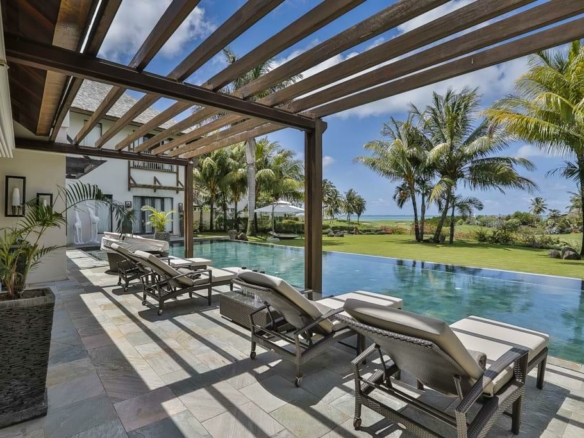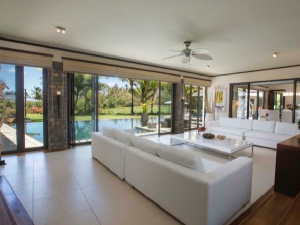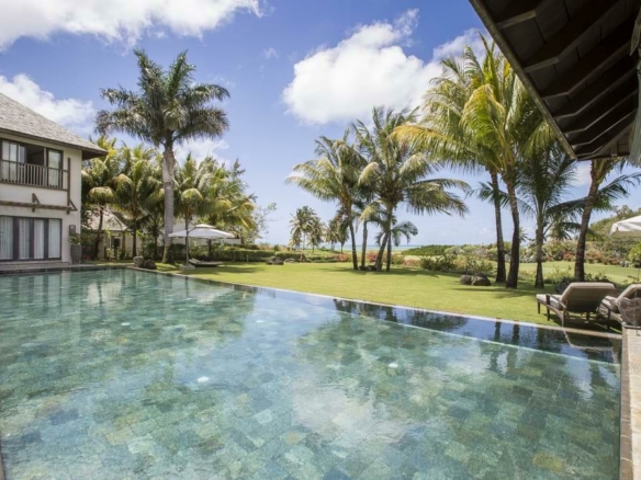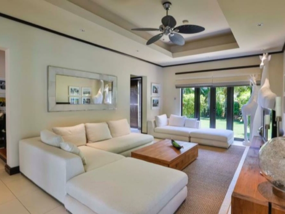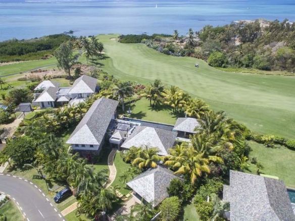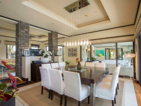 Discover this extraordinary villa, perfectly situated within a prestigious golf estate that sprawls across 213 hectares of lush tropical gardens along Mauritius’ enchanting east coast. This villa showcases impeccable living spaces with breathtaking panoramic vistas that encompass the expansive swimming pool, the fourth hole of the golf course, verdant nature, and the tranquil sea. Notably, the living room and one of the master bedrooms on the first floor provide particularly awe-inspiring vistas.