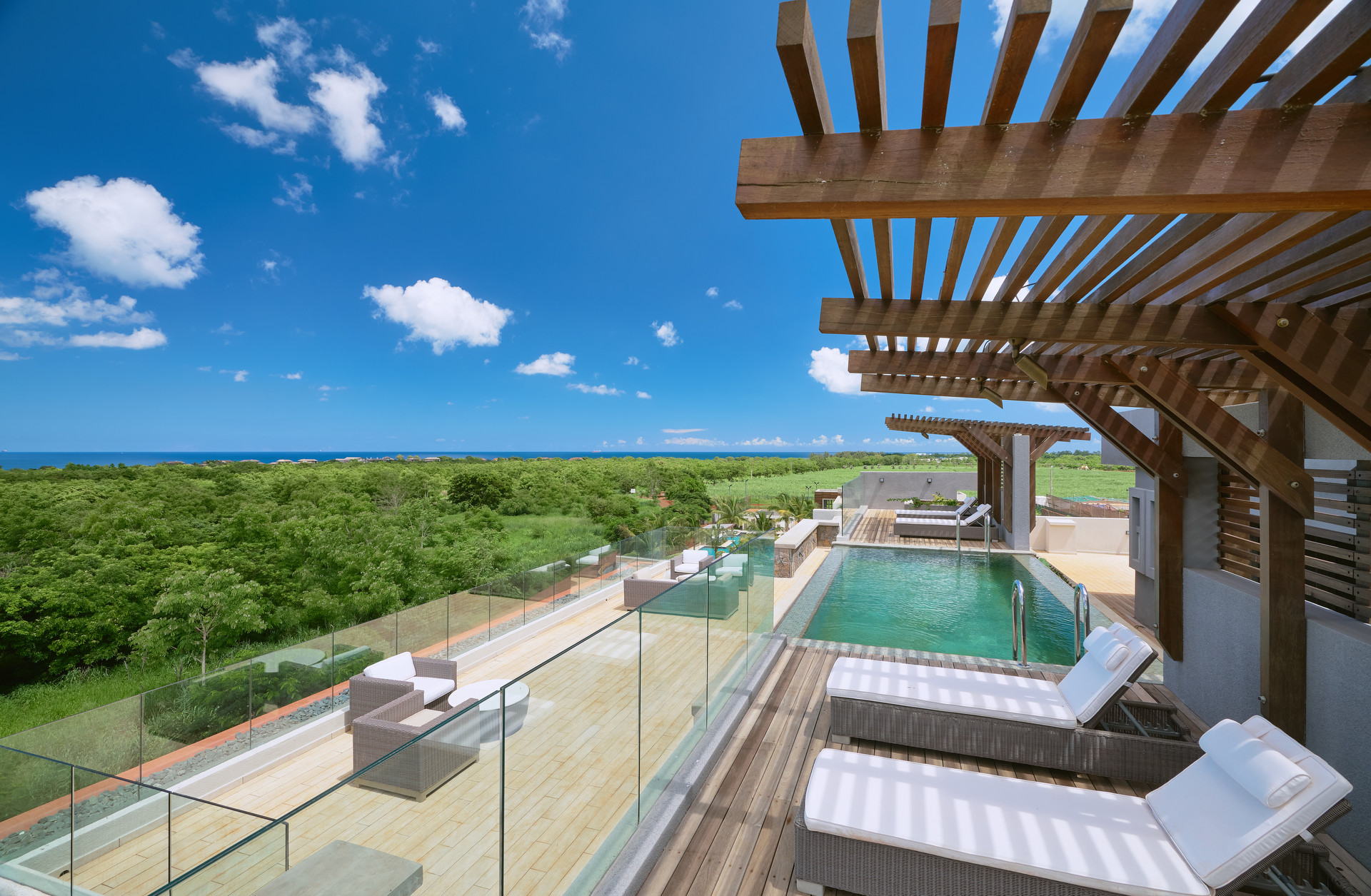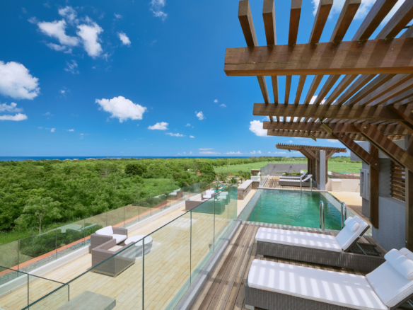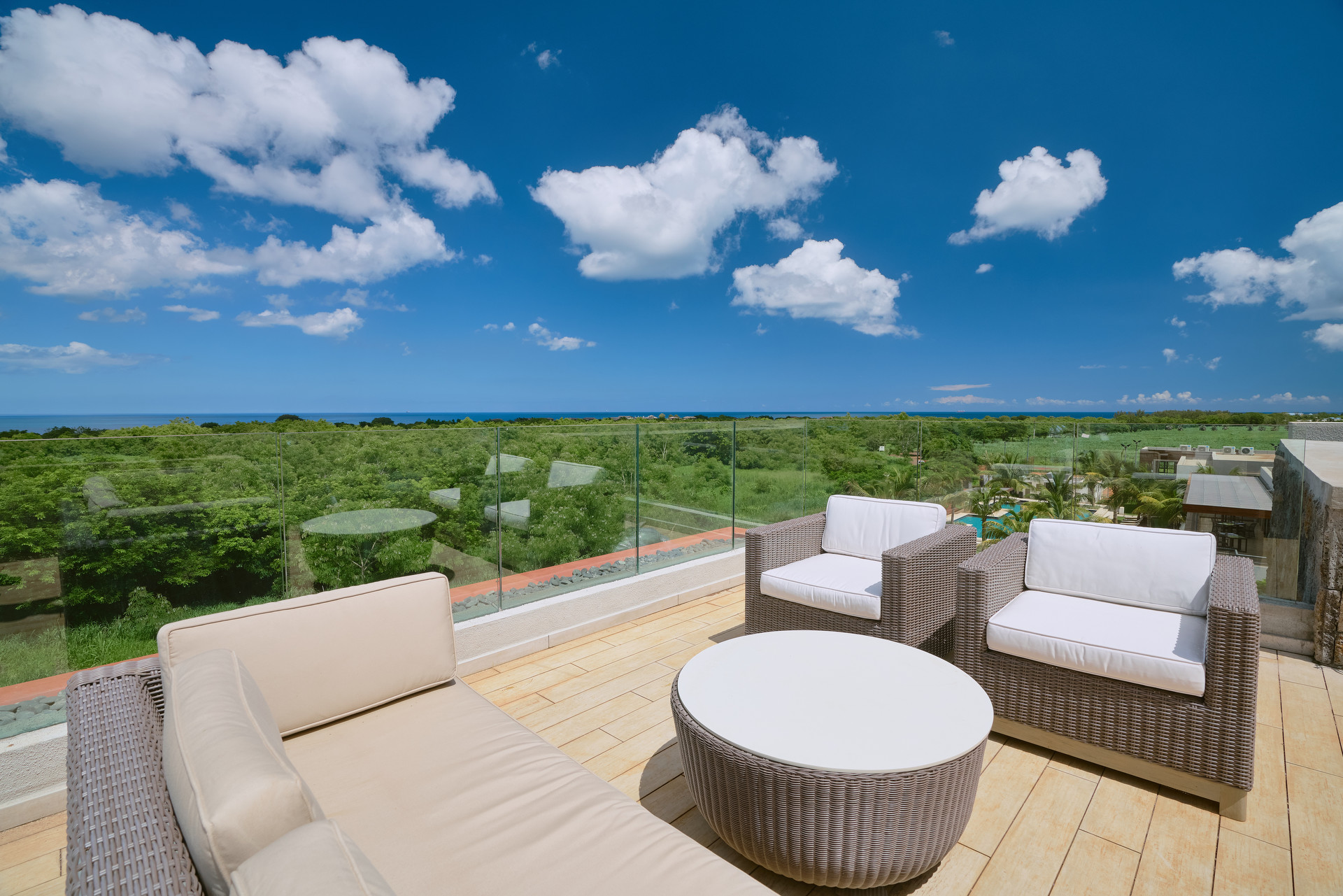 Elevator access awaits, whisking you to a remarkable pool deck with panoramic ocean views, providing a serene oasis to unwind. Additionally, relish in your private ocean-facing terrace, perfect for tranquil moments.