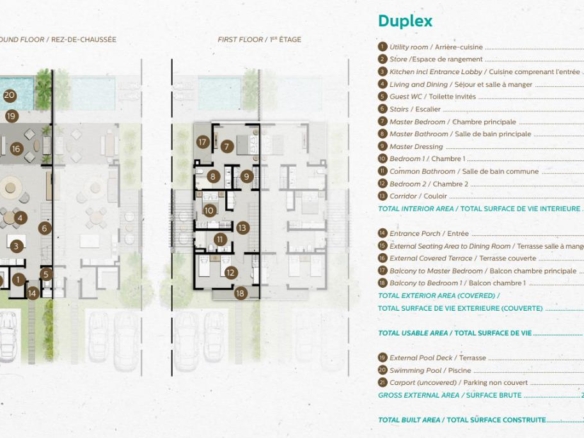 The master bedroom is connected with its own and separate master bathroom including master dressing. There are two other beautiful bedrooms and one other main bathroom. The architect and interior designer have planned every detail for a synergised living space. With the verandah opening onto the pool and the garden revealing a beautiful view of the South East’s natural ponds; these duplexes do offer an ideal balance between green settings and a seaside spirit. The total gross area is of your property will be two hundred and fifty-nine metres square. Other homely features of these exquisite duplexes are: a utility room, a store room, the kitchen including entrance lobby, the living and dining, a guest WC, your stairs, the entrance porch, the external seating area to the dining room and your external covered terrace.