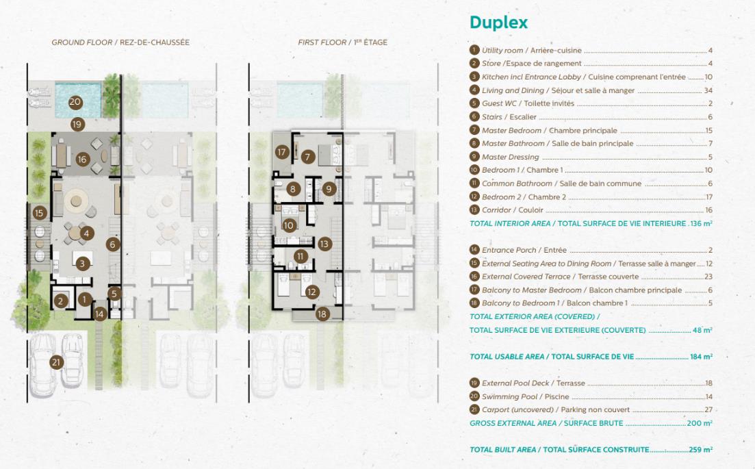 Your brand new, off-plan three-bed and two-baths DUPLEX, does boast a net liveable area of one hundred and eighty-four metres square plus two of your rooms will have private balconies. One balcony of six metres square for the master bedroom and another balcony of five metres square for another room. Your car port in your new off-plan duplex will be able to accommodate space for two cars. Another very unique feature of this off-plan duplex is your very own personal eighteen metres square private pool.