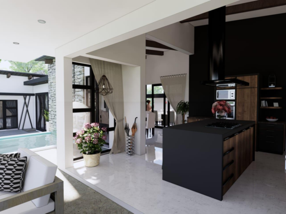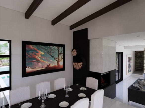 The open plan living, dining room opens onto the patio, drawing a warm ambiance of natural light in which to indulge in pure gastronomic decadence.