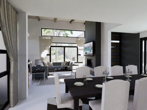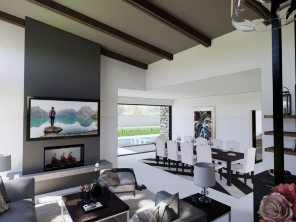 The open plan living, dining room opens onto the patio, drawing a warm ambiance of natural light in which to indulge in pure gastronomic decadence.
